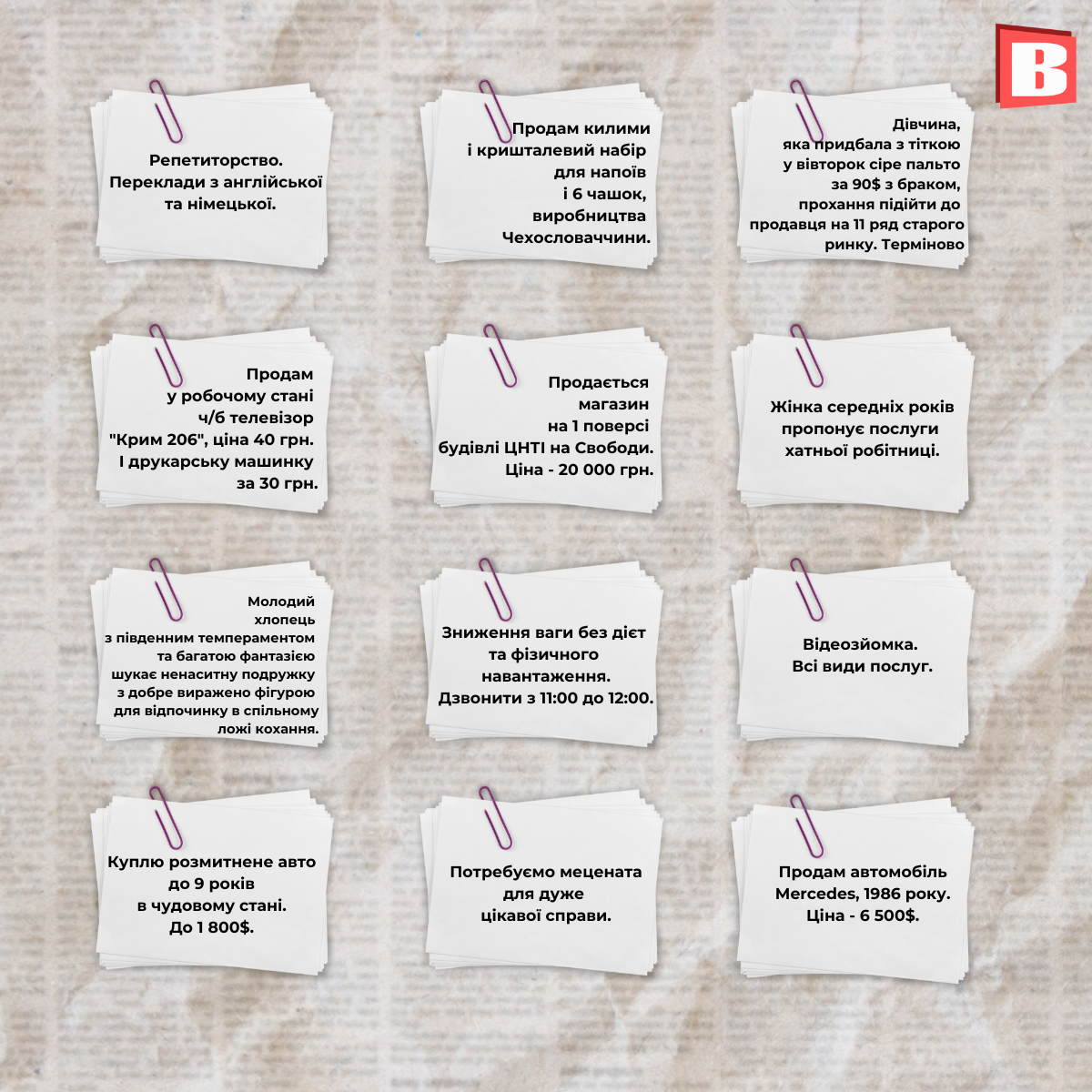 Окреме місце в газетах займають оголошення та реклама. Останнє, за словами перших працівників редакції ВСІМ, було на той час, особливо прибутковою справою. Мовляв, реклама в інтернеті тоді ще не була такою популярною, як зараз. Саме тому її розміщували в газетах і на стовпах.