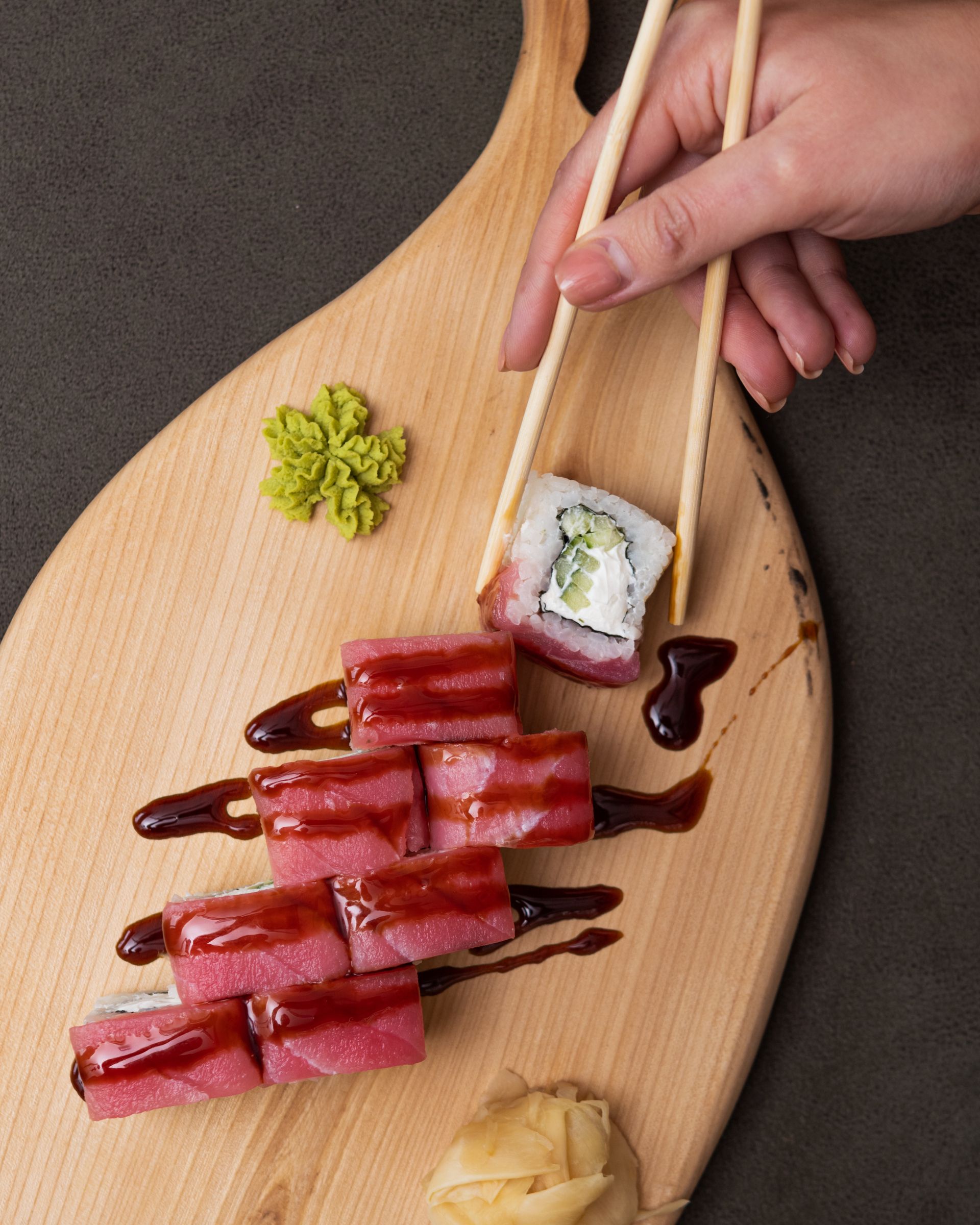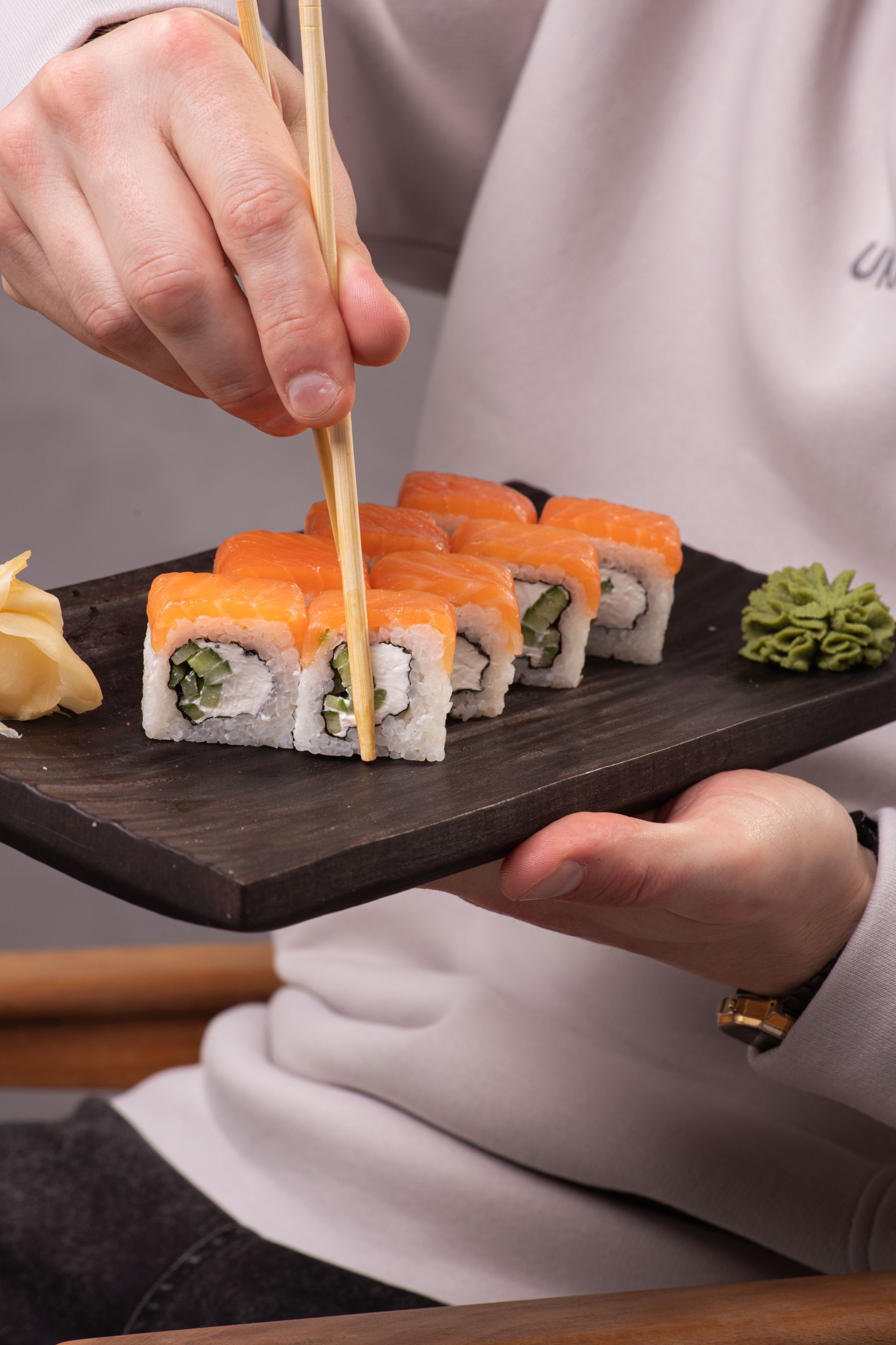 - Роли - макі та футомакі (в тому числі веганські варіанти), темпура-роли, чіз-роли, а також Філадельфія, Каліфорнія, Дракони.