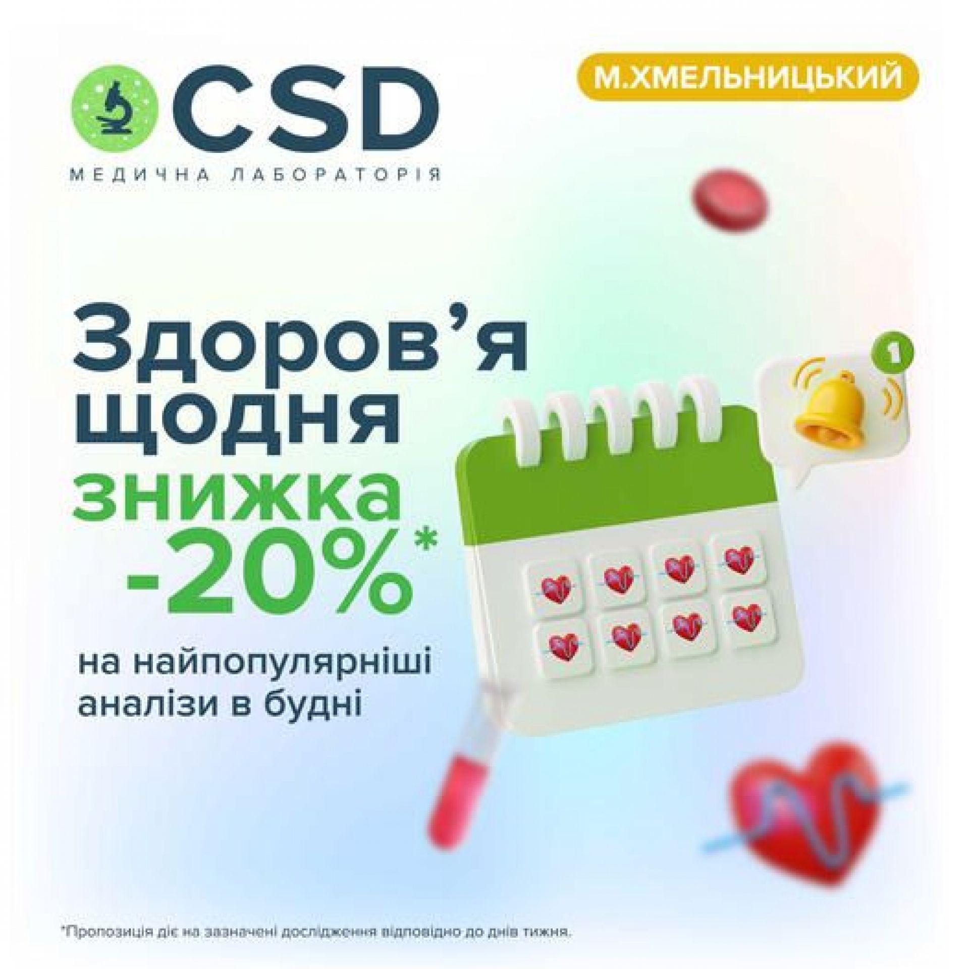 Акція: Турбота про власне здоров'я у будь-який час повинна залишатися гарною звичкою. Для усіх, хто щоденно турбується про свій організм медична лабораторія CSD має спеціальну пропозицію: знижка 20% щодня на найпопулярніші дослідження.