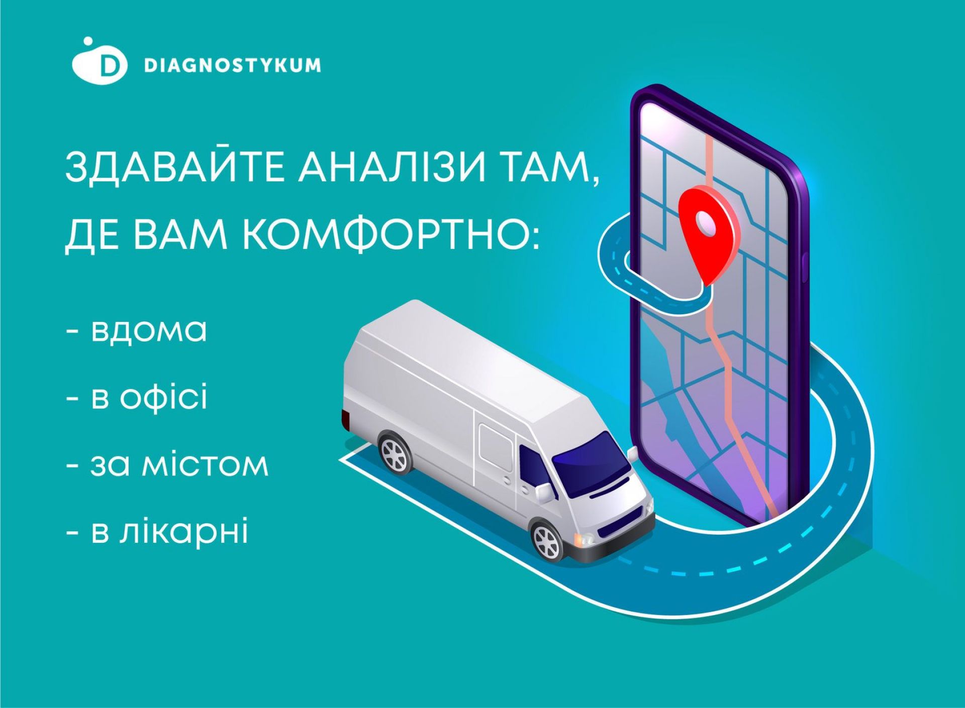 З турботою про пацієнтів запровадили нову послугу - "Аналізи вдома". Тож тепер немає потреби шукати лабораторію, відпрошуватись з роботи й витрачати свій час. Медсестру з необхідним інвентарем та матеріалами можна запросити додому. У визначену дату вона приїде за адресою й візьме необхідні зразки. Після їх обробки пацієнту прийде СМС-повідомлення й результати з'являться в особистому електронному кабінеті. За потреби, їх можна роздрукувати в будь-якому з відділень мережі “Діагностикум”.