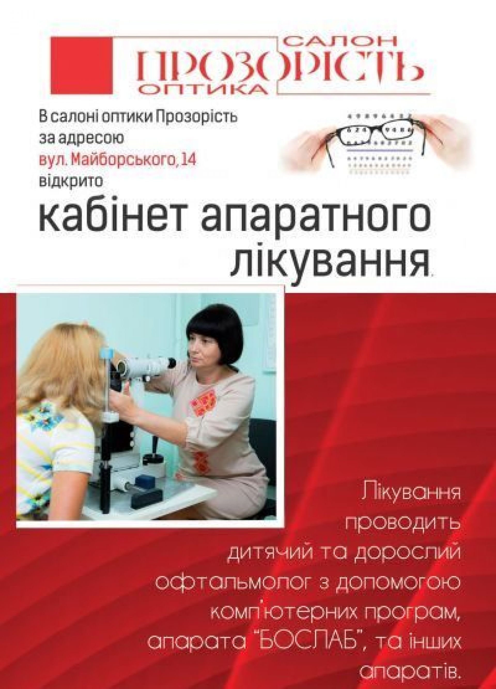 У салоні-оптика «Прозорість» за адресою вул. Майборського, 14 працює обладнаний спеціалізований кабінет апаратного лікування. Лікування відбувається за допомогою комп’ютерних програм, апарату «БОСЛАБ» та інших провідних апаратів. Записати дитину на прийом можна до дитячого офтальмолога лікаря вищої категорії Равчук Ірини Миколаївни. Вона займається лікуванням таких хвороб, як рефракційна патологія (короткозорість, далекозорість, астигматизм), косоокість та амбліопія.