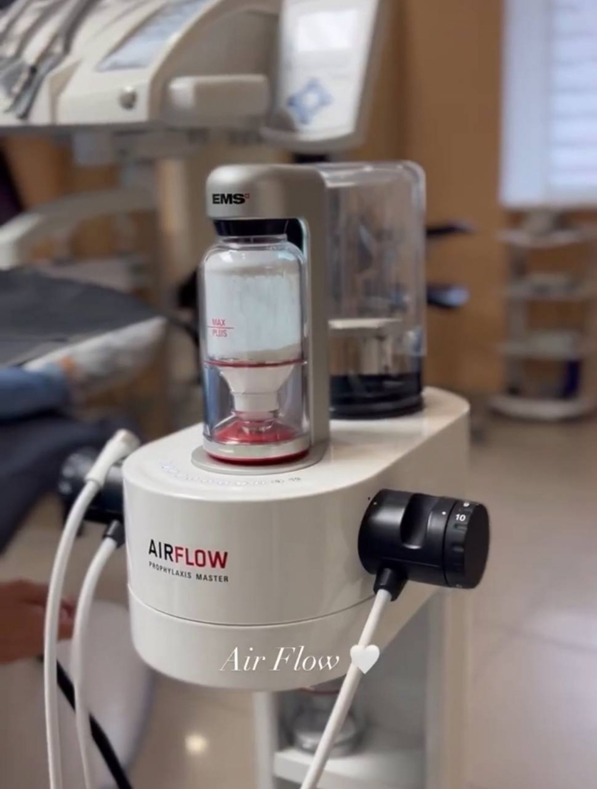 Air Flow, обробляє поверхню зуба за допомогою струменя порошку та води. До його складу входять гранули карбонату кальцію круглої форми, які усувають залишки нальоту та пігментації, без нанесення шкоди емалі та ясна. Не приносить пацієнту неприємних відчуттів під час процедури, має нейтральний присмак, на відміну від порошків, що містять соду!