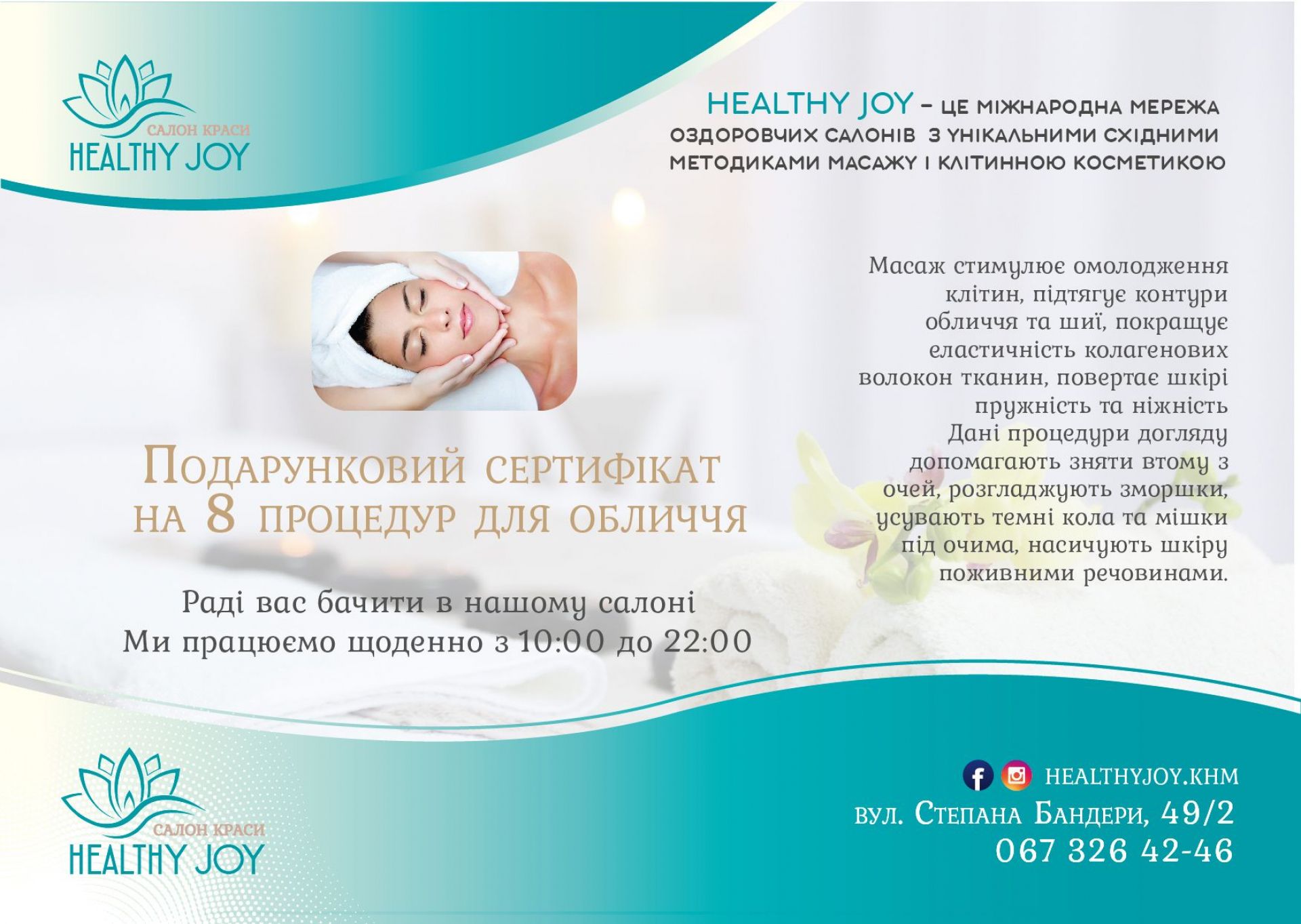 Салон «Healthy joy» - це міжнародна мережа оздоровчо-профілактичних салонів з унікальними східними методиками і клітинною косметикою, які розробляються на базі давньої китайської медицини та впровадження інноваційних технологій V покоління.