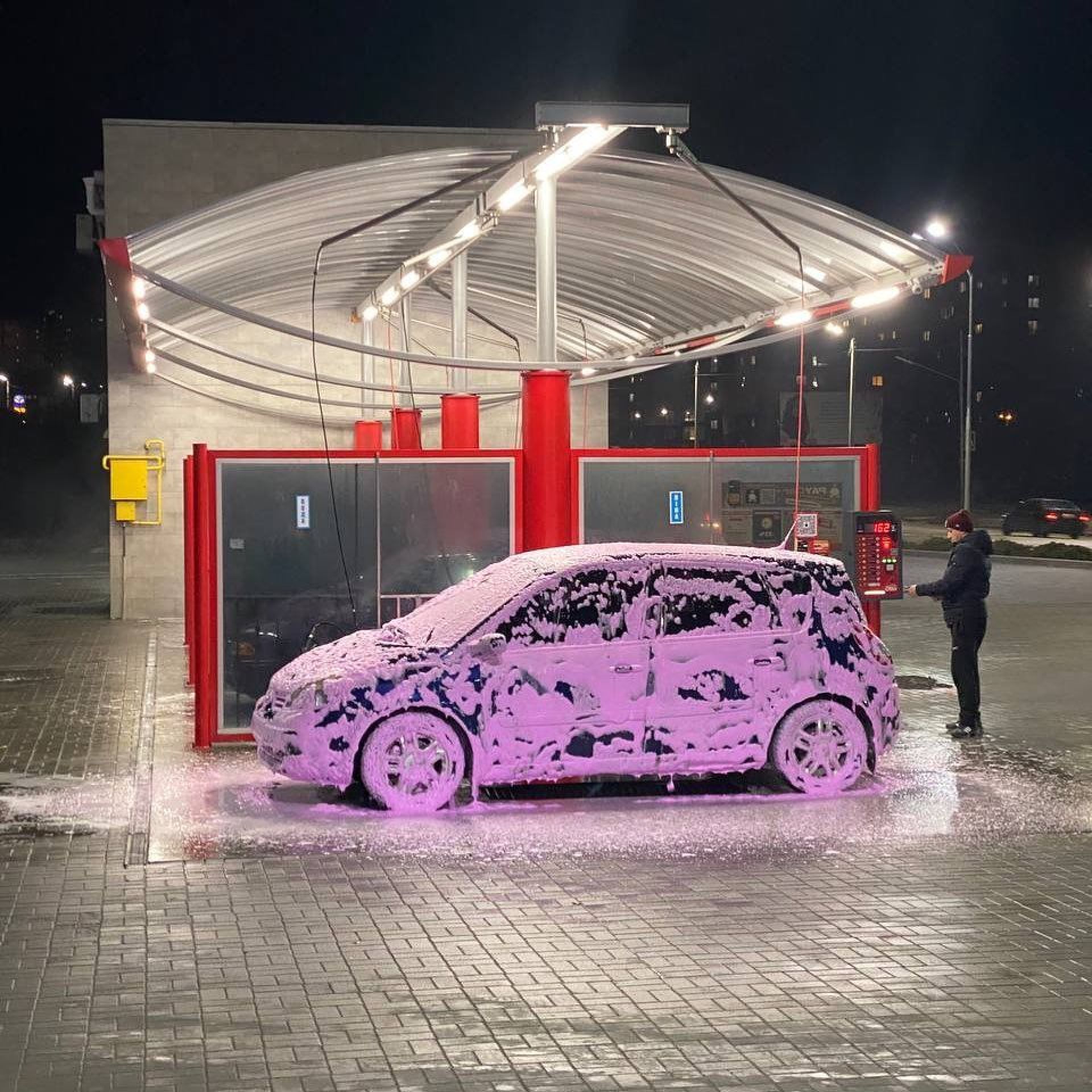 Цілодобова мийка має 5 постів із сучасними модулями управління Х20, на кожному з них для зручності розміщена кнопка виклику оператора. Додатково вони оснащені пилососами з нержавійки, також є апарат з продажу склоомивної рідини й установка для чорніння шин – і це все в одному корпусі. Обладнання має найкращу комплектацію – PRO+.