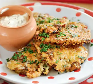 Гриби (500 грам) дрібно порізати, цибулину натерти або подрібнити за допомогою блендеру. Змішати гриби, цибулю, яйця (3-4 штуки), крохмаль (6 столових ложок), додати сіль і перець за смаком.