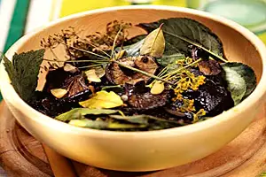 Проварити ще п’ять хвилин з перцем та лавровим листом. Змішати все з порізаними грибами та свіжими сливами, додати чайну ложку вершкового масла.
