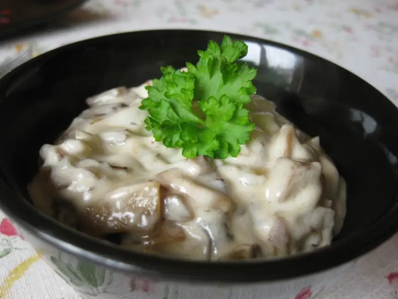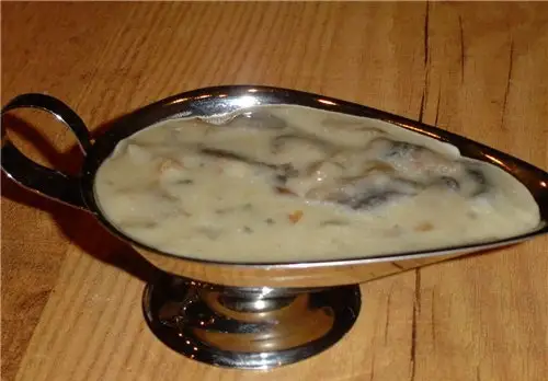 Гриби (600 грам) подрібнити та тушкувати разом із подрібненою цибулею до повного випарювання соку. Додати 1 столову ложку борошна, пів склянки сметани чи вершків і все це довести до кипіння.
