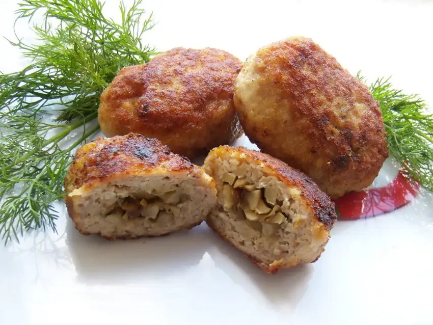 Замочити у молоці м’якоть батону (невеличкий шматок до 5 сантиметрів). На рослинній олії підсмажити до золотого кольору подрібнену цибулину. Свіжі гриби (650 грам) порізати на маленькі шматочки. Гриби смажити на рослинній олії доки майже не випариться сік, після чого підсолити, зменшити вогонь та підсмажити до повного випарювання (доводити до хрусткої скоринки не треба).