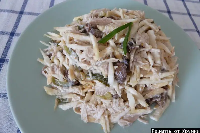 Порізати також мариновані гриби (150 грам) та кисло-солодкі яблука (250 грам). Все змішати, приправити перцем, соком лимону та змішати з майонезом. Можна прикрасити листям петрушки.