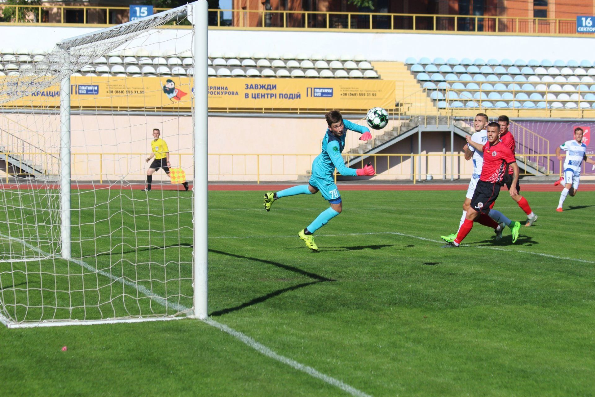 Задерецький розвернув атаку в іншу сторону. перевівши м’яч на абсолютно вільного Пріхну. Правий захисник “Поділля” мав час спокійно обробити м’яч і подивитися на розташування партнерів. Далі був точний навіс на Каверіна. Лідер атак “Поділля” завис у повітрі і головою переправив сферу в сітку - 1:0.