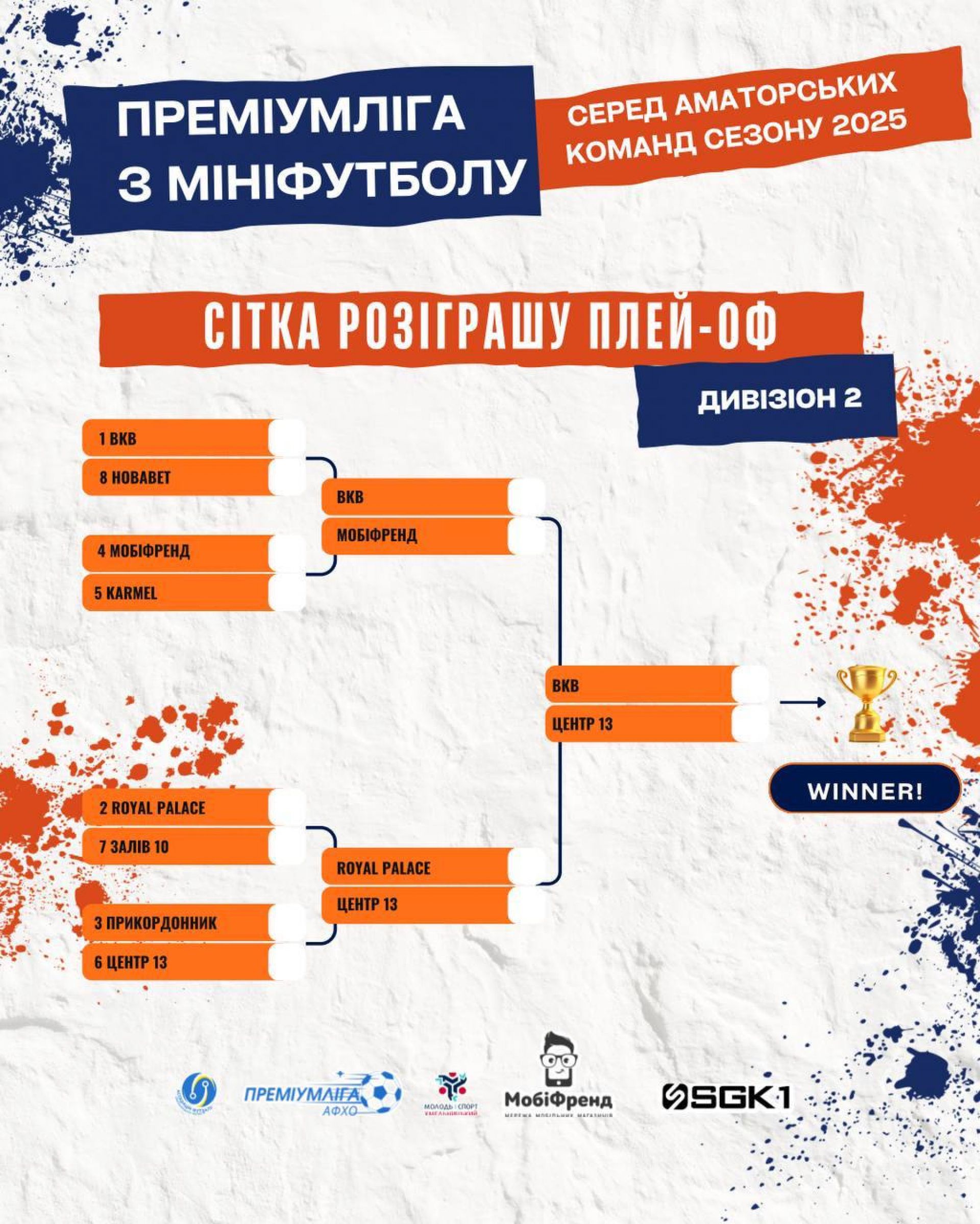Була серія із трьох матчів і в дивізіоні 2. Тут Центр 13, після поразки від Royal Palace (2:4) зумів двічі перемогти (4:1, 5:0) і вийти до фіналу. В іншій парі ВКВ спочатку лише в серії пенальті здолало МобіФренд. В другому матчі «ветерани» перемогли 5:0. Додамо, що ВКВ і Центр 13 зустрічалися у фіналі й минулого сезону (у дивізіоні 3).