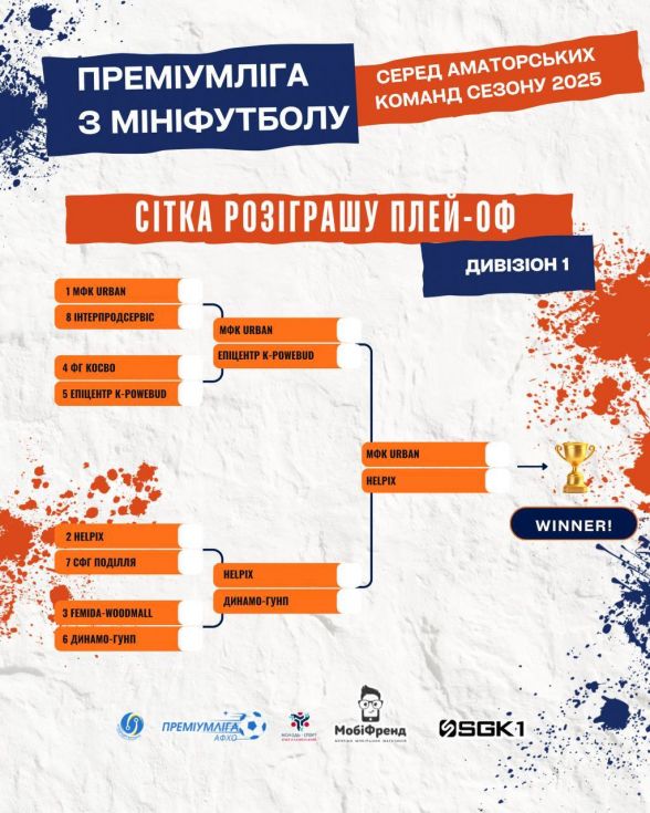 У дивізіоні 1 другий рік поспіль у фінальній серії зіграють Helpix та Urban. Перші в 1/2 фіналу двічі перемогли Динамо-ГУНП (4:1, 5:1). Важчим шлях до фіналу був для Urban. В першому матчі команда поступилася Епіцентр-К-PowerBUD (2:2, 6:7 по пенальті). Але виграла серію завдяки двом перемогам з однаковим рахунком — 4:1. Додамо, що Helpix та Urban також зіграють у фіналі кубка міста.