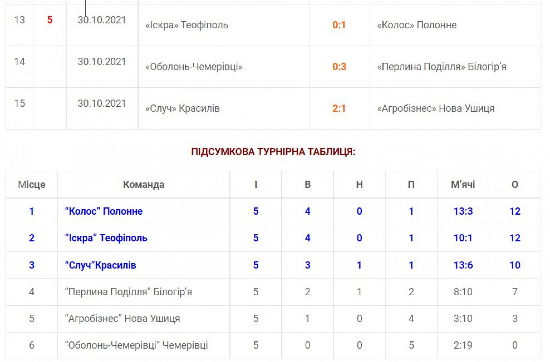 Найбільше уваги було прикуто до матчу в Теофіполі. Тут визначалося те, хто стане чемпіоном. Певну перевагу мали господарі. "Іскра" до цього виграла всі свої матчі із різницею м'ячів 10:0. Аби залишитися на першій сходинці, команда мала не програти вдома. "Колос" влаштовувала лише перемога. Гості її здобули - 1:0. "Колос" із Полонного - чемпіон Хмельницької області з футболу 2021 року.