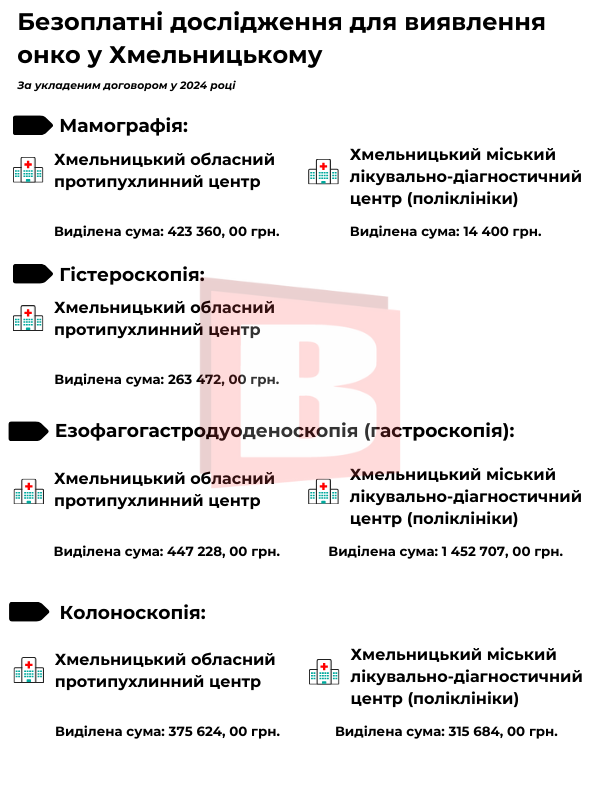 У яких саме медзакладах Хмельницького виконують безоплатно ці дослідження (за умови наявності направлення, - прим.автора) та скільки на це виділено коштів - переглядайте далі в інфографіці.