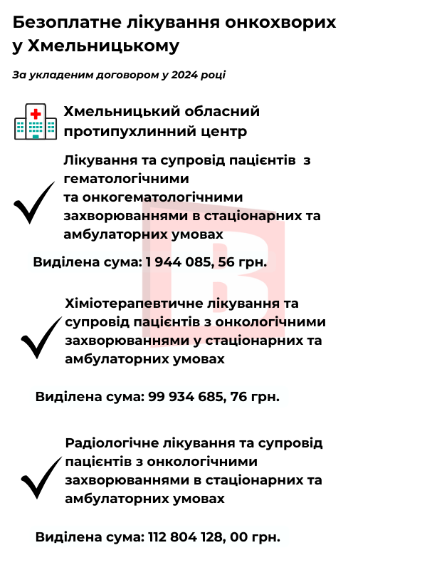 Крім того, станом на 8 лютого, договір із НСЗУ щодо лікування онкохворих уклав лише один заклад у Хмельницькому - обласний протипухлинний центр. У рамках Програми медичних гарантій, у центрі надають наступні послуги:
