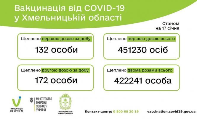 За минулу добу на Хмельниччині зробили 364 щеплення від COVID-19. Першу дозу щеплення отримали 132 особи, а 172 – два щеплення.