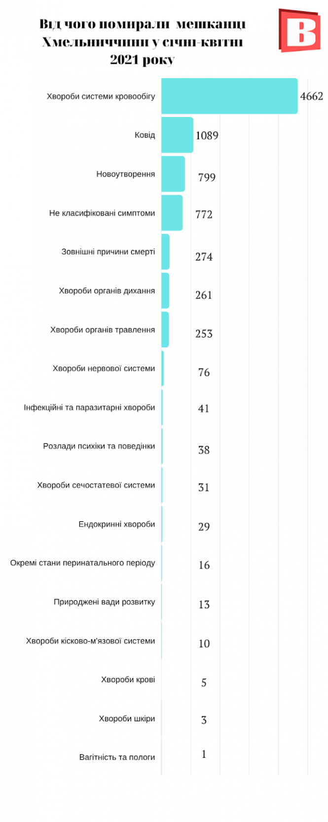 Наприкінці рейтингового списку знаходяться вагітність та пологи, хвороби крові та шкіри. Через них за останні два роки на Хмельниччині померли одиниці.