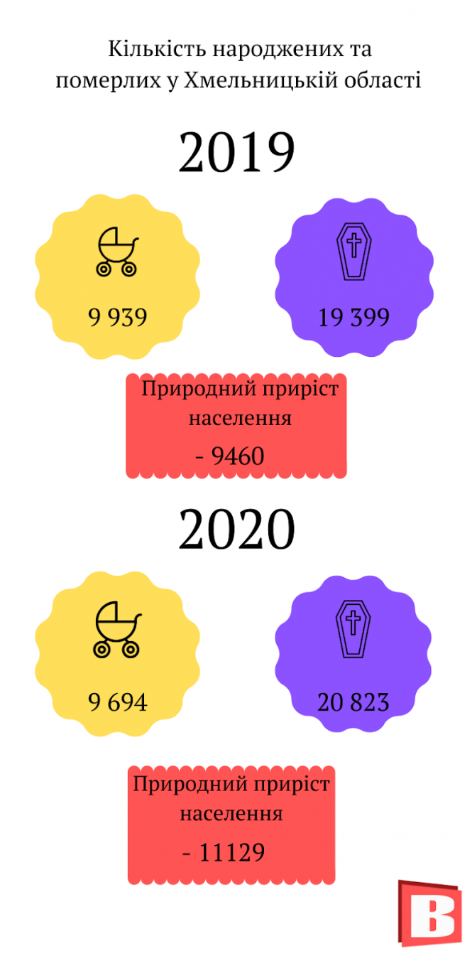 Так, в Хмельницькій області рівень смертності перевищує рівень народжуваності майже вдвічі. До того ж у порівнянні з 2019 роком, у 2020 народжень було на 245 менше, а смертей на 1 424 більше.