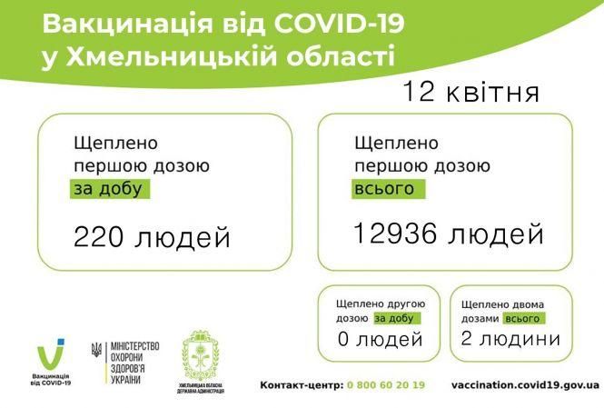 За минулу добу в Хмельницькій області від COVID-19 вакциновано першою дозою 220 осіб. Всього з початку вакцинальної кампанії в області першою дозою щеплено 12 936 осіб. Два щеплення отримали 2 людини. Про це 13 квітня повідомили у пресслужбі ОДА.
