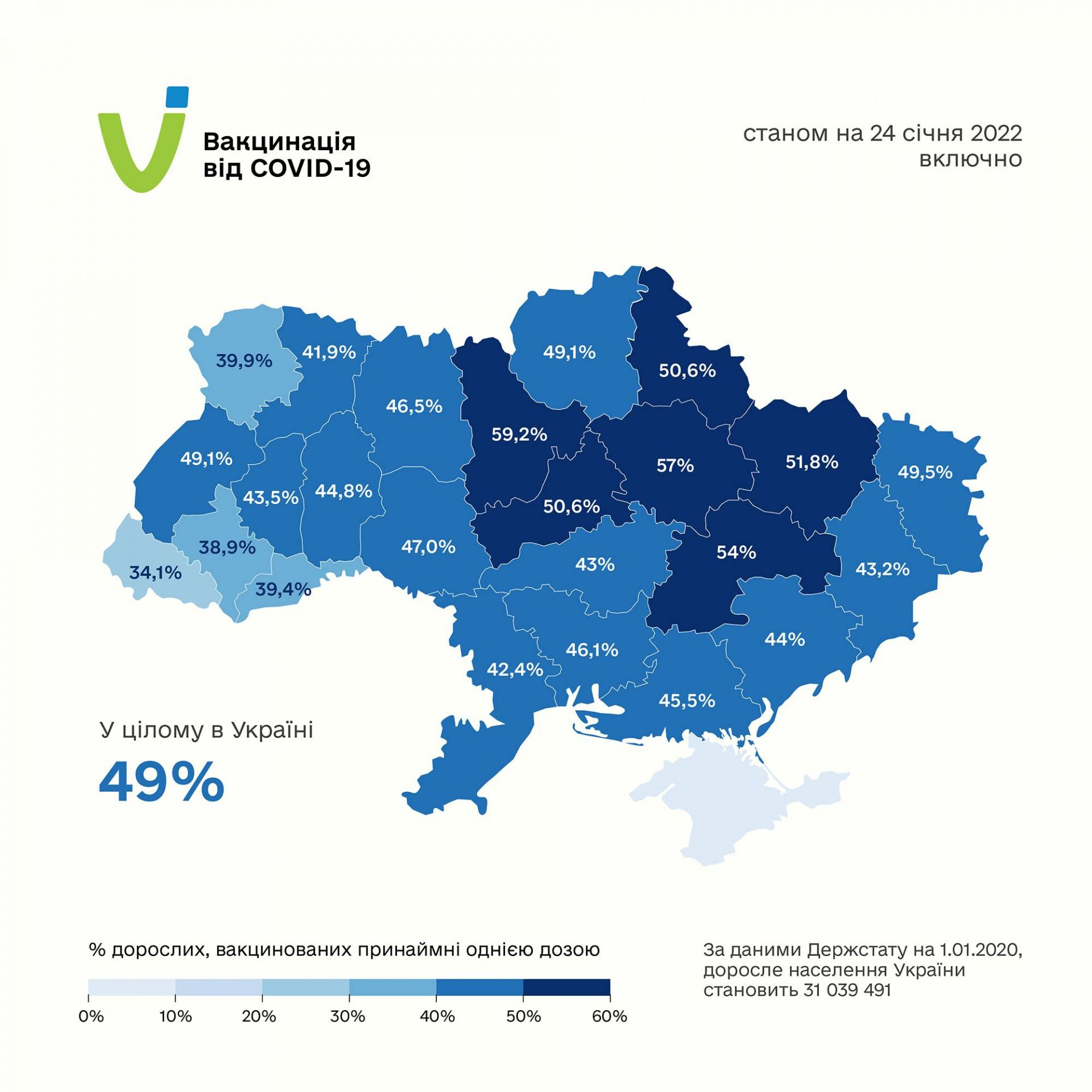 Водночас у відомстві додають, що найвищий показник у місті Києві, де щеплення отримали вже 71% населення. Є регіони, де таких майже вдвічі менше. До позначки в 40% не дотягують поки в Закарпатській, Івано-Франківській, Чернівецькій та Волинській областях.