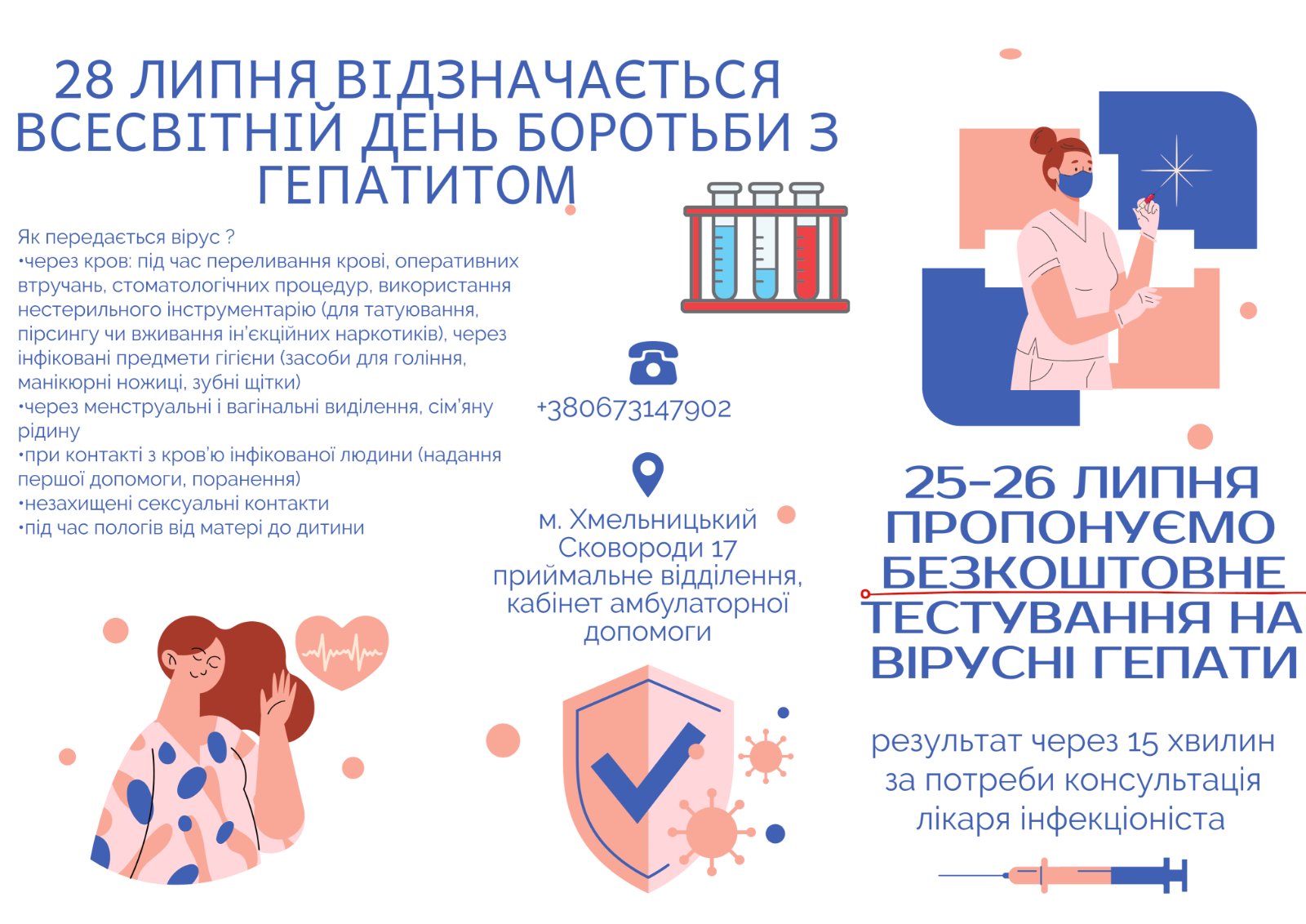 До Всесвітнього дня боротьби з вірусними гепатитами мешканці Хмельницького можуть безкоштовно пройти тестування на вірусні гепатити В та С. Таку можливість нададуть у Хмельницькій інфекційній лікарні, повідомили у пресслужбі медустанови.