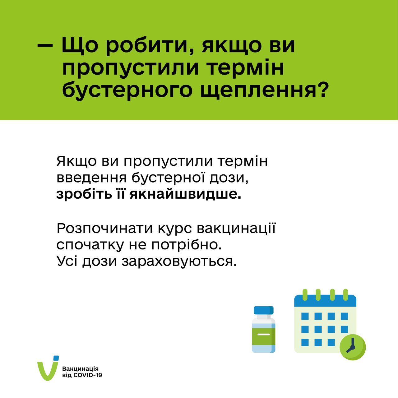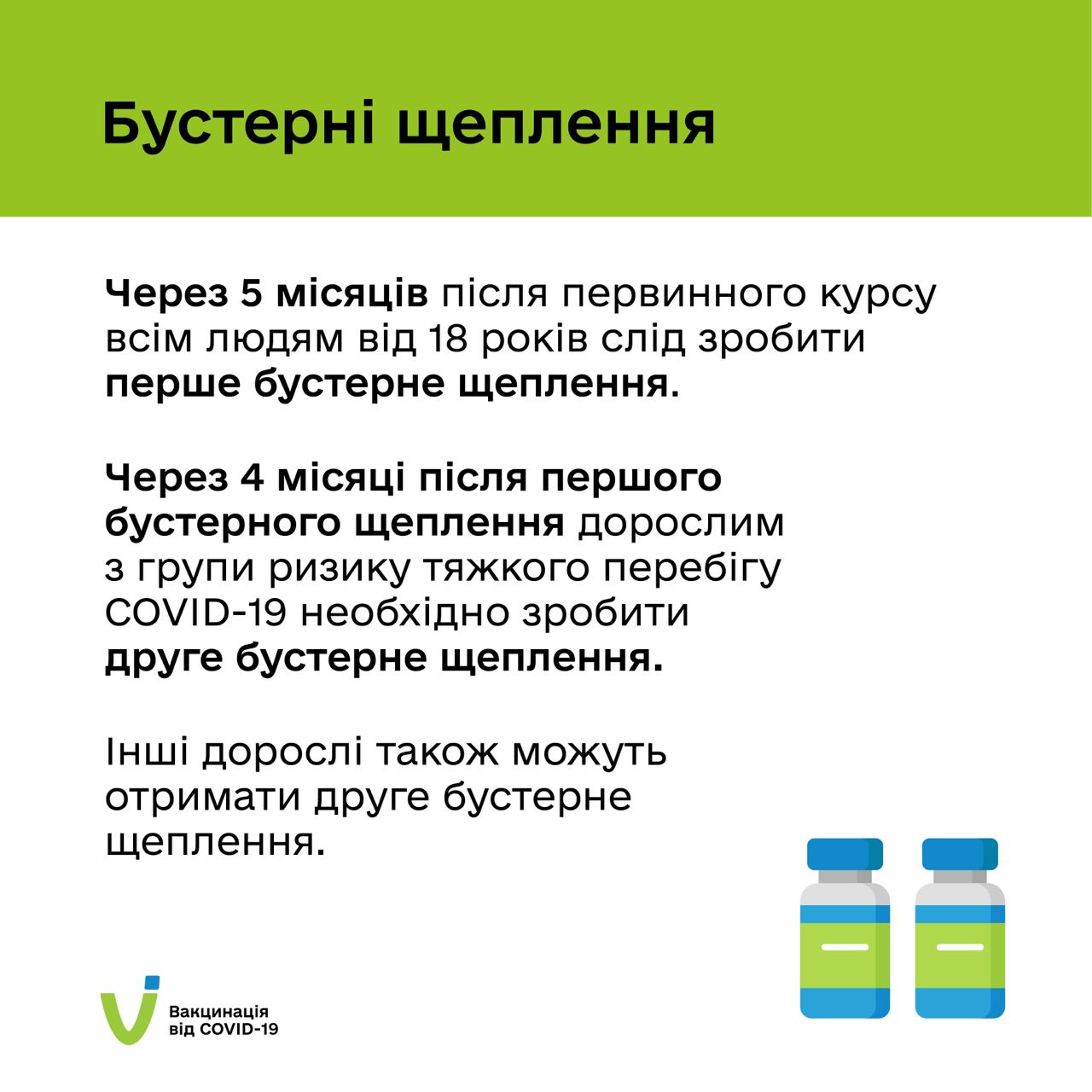 — Друга бустерна доза дозволяється всім повнолітнім з інтервалом щонайменше 4 місяці після першої бустерної дози. Проте особливо радимо її робити людям із хронічними захворюванням та людям віком 60+, — йдеться в повідомленні МОЗ.