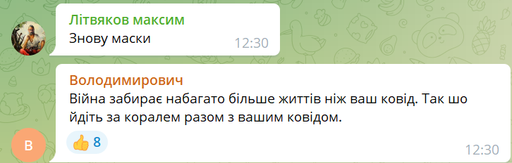Самі містяни в соцмережах не надто бурхливо обговорюють новину. Вони проводять паралелі, що війна та інші хвороби щодня забирають більше життів, ніж коронавірус. Та порівнюють "ковід" зі звичайним грипом: