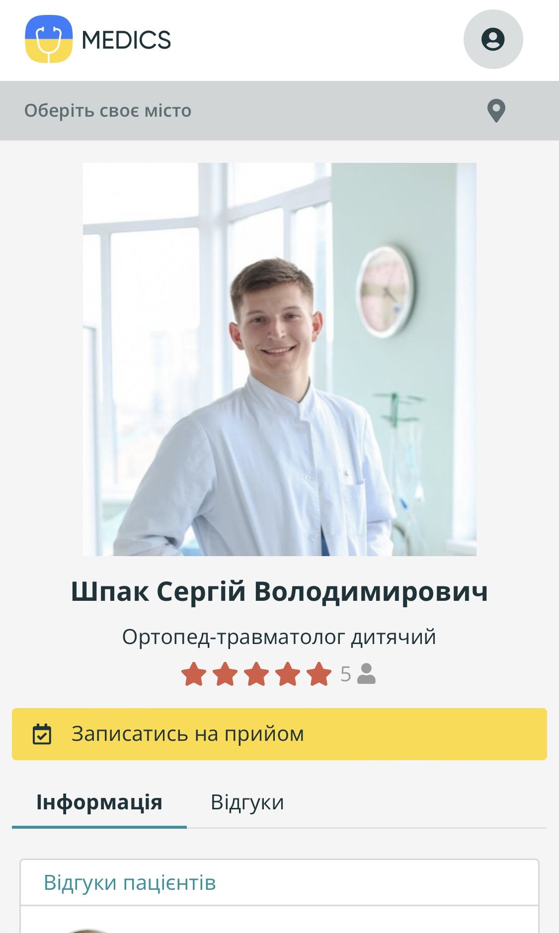 Ортопеда-травматолога Сергія Шпака оцінили найвищим балом. А ще залишили 5 відгуків. Усі вони є позитивними.