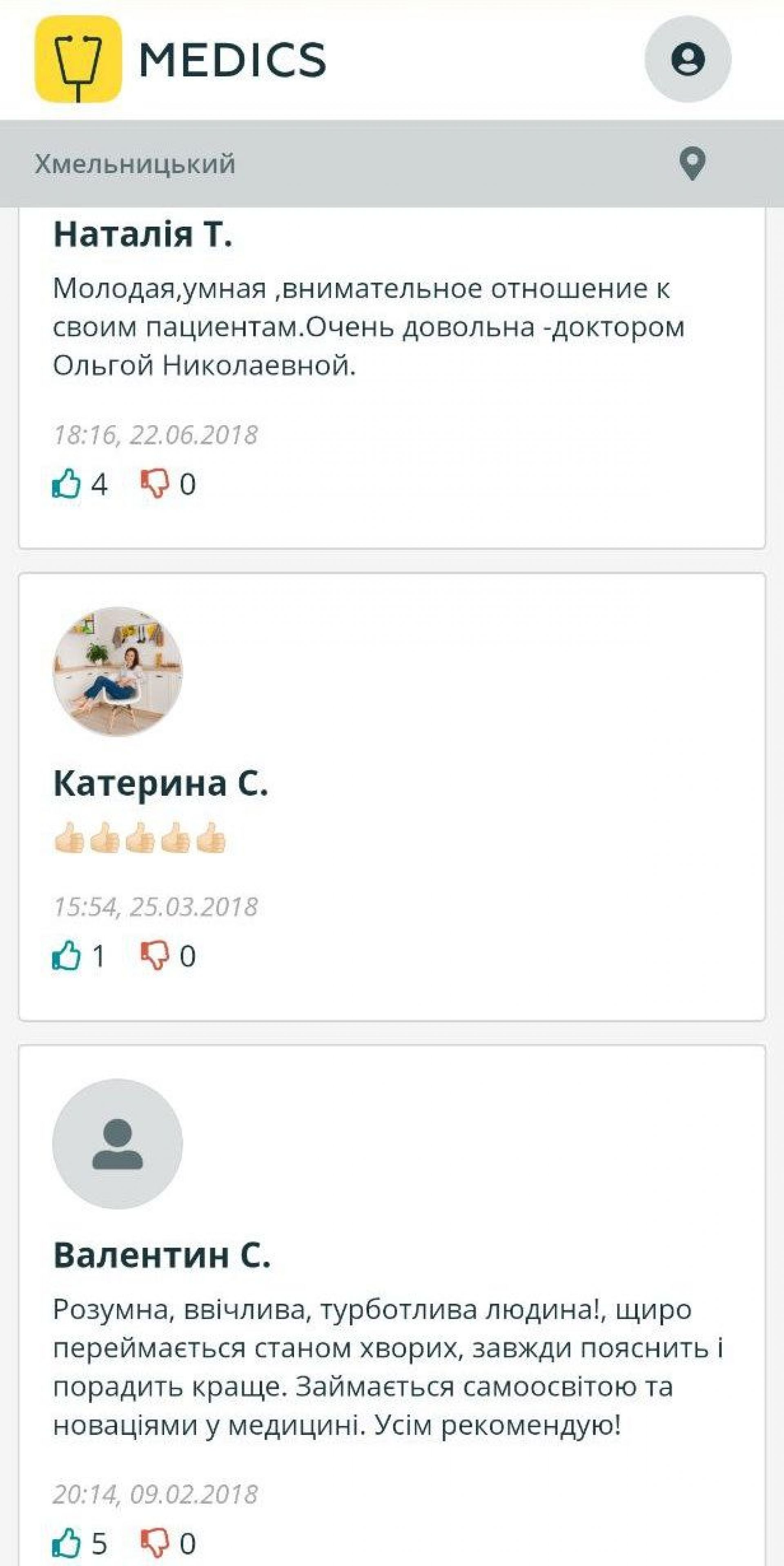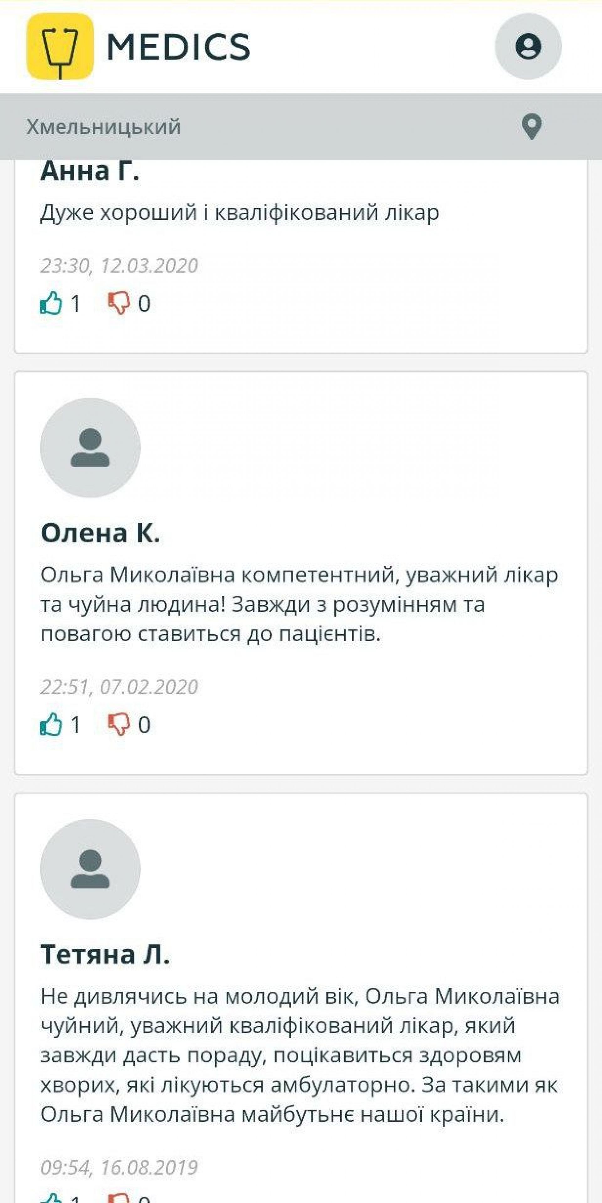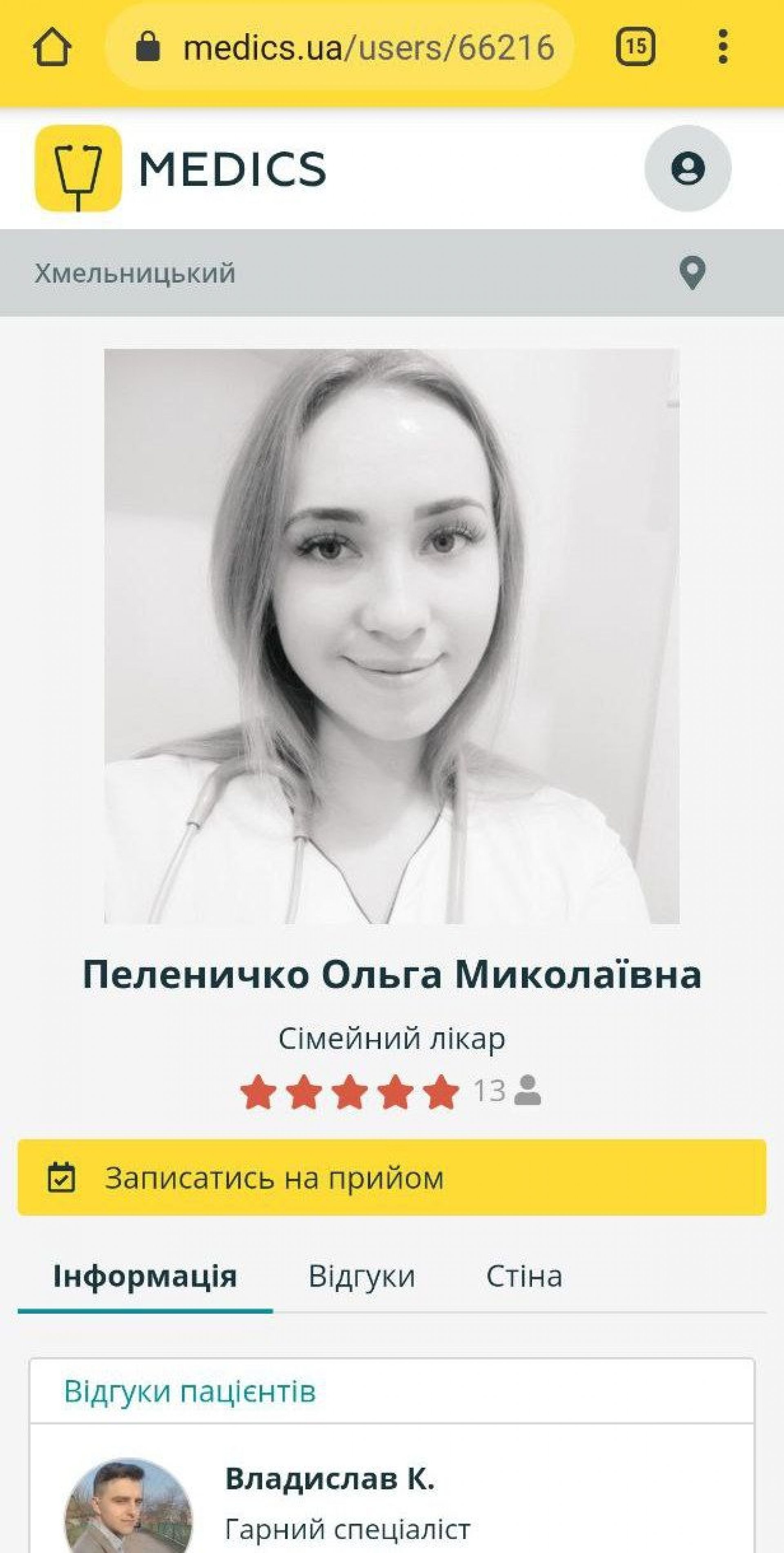 Хмельничани можуть поставити свою оцінку лікарю за 5-ти бальною шкалою. Або ж залишити відгук. Сімейного лікаря Ольгу Пеленичко містяни оцінили найвищим балом. А ще залишили 13 коментарів. Усі вони є позитивними.
