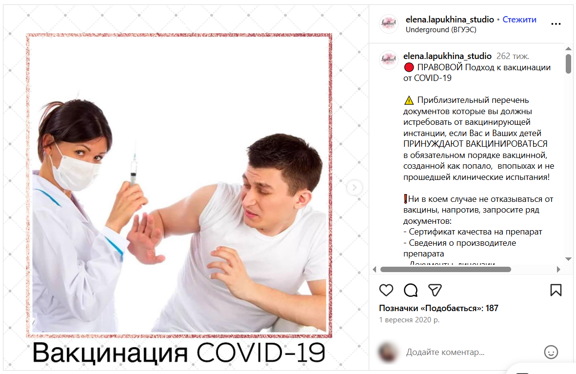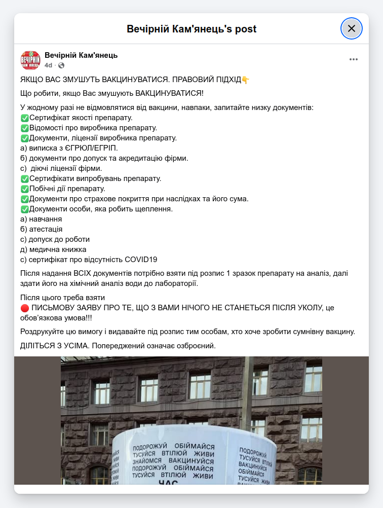 Кам’янець-Подільське медіа «Вечірній Кам’янець» на своїй Facebook-сторінці опублікувало пост антивакцинаторського змісту російського походження. Він датується 5 вересня, але не є власним контентом видання. Пошук вказує на те, що текст поста вперше був опублікований в Інтернеті не пізніше 1 вересня 2020 року, тобто понад п’ять років тому. Скріншот публікації «Вечірнього Кам’янця» нижче. На момент підготовки цього матеріалу пост мав майже 24 тисячі реакцій, понад 3 тисячі коментарів та понад 14 тисяч поширень.
