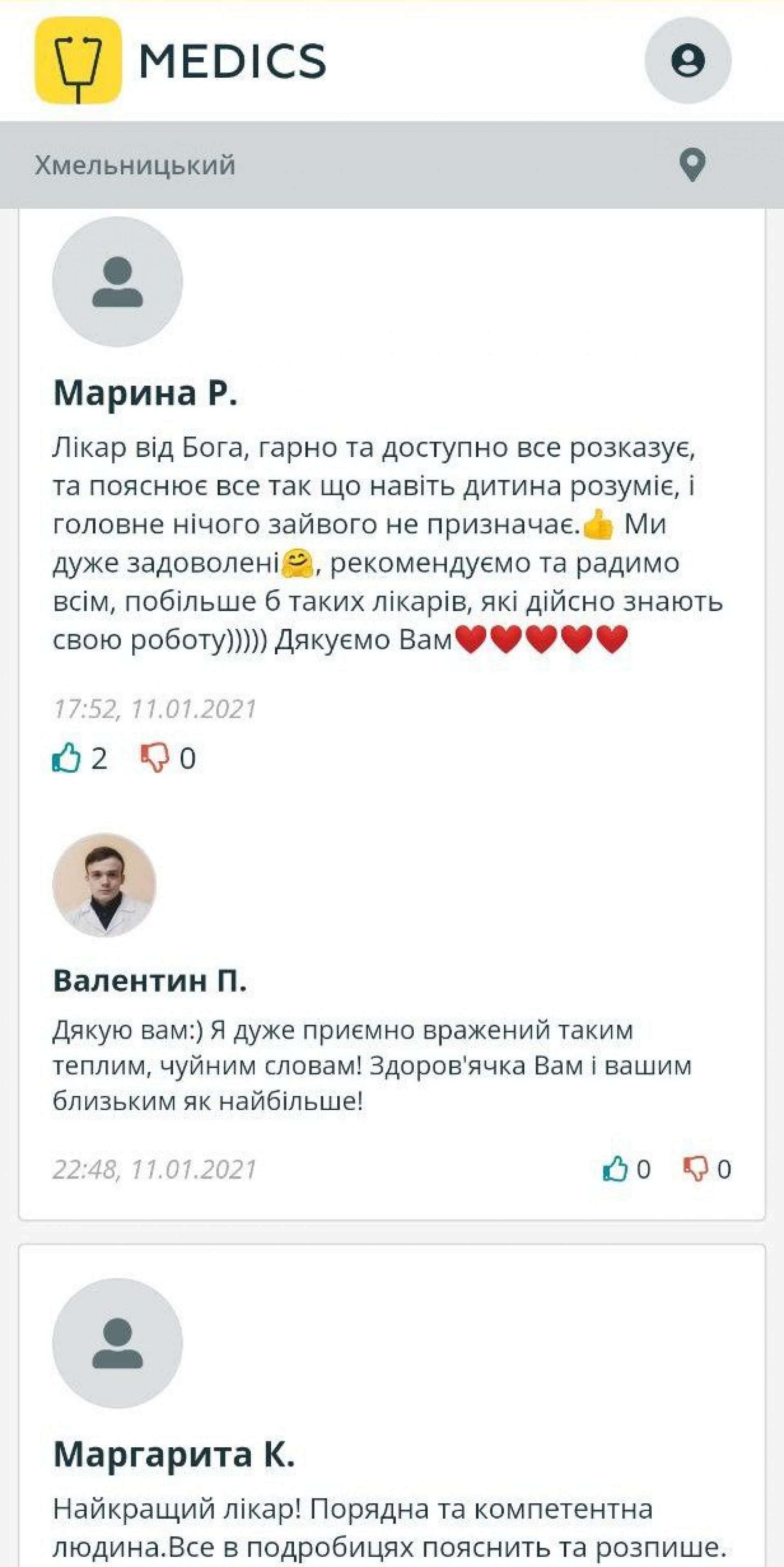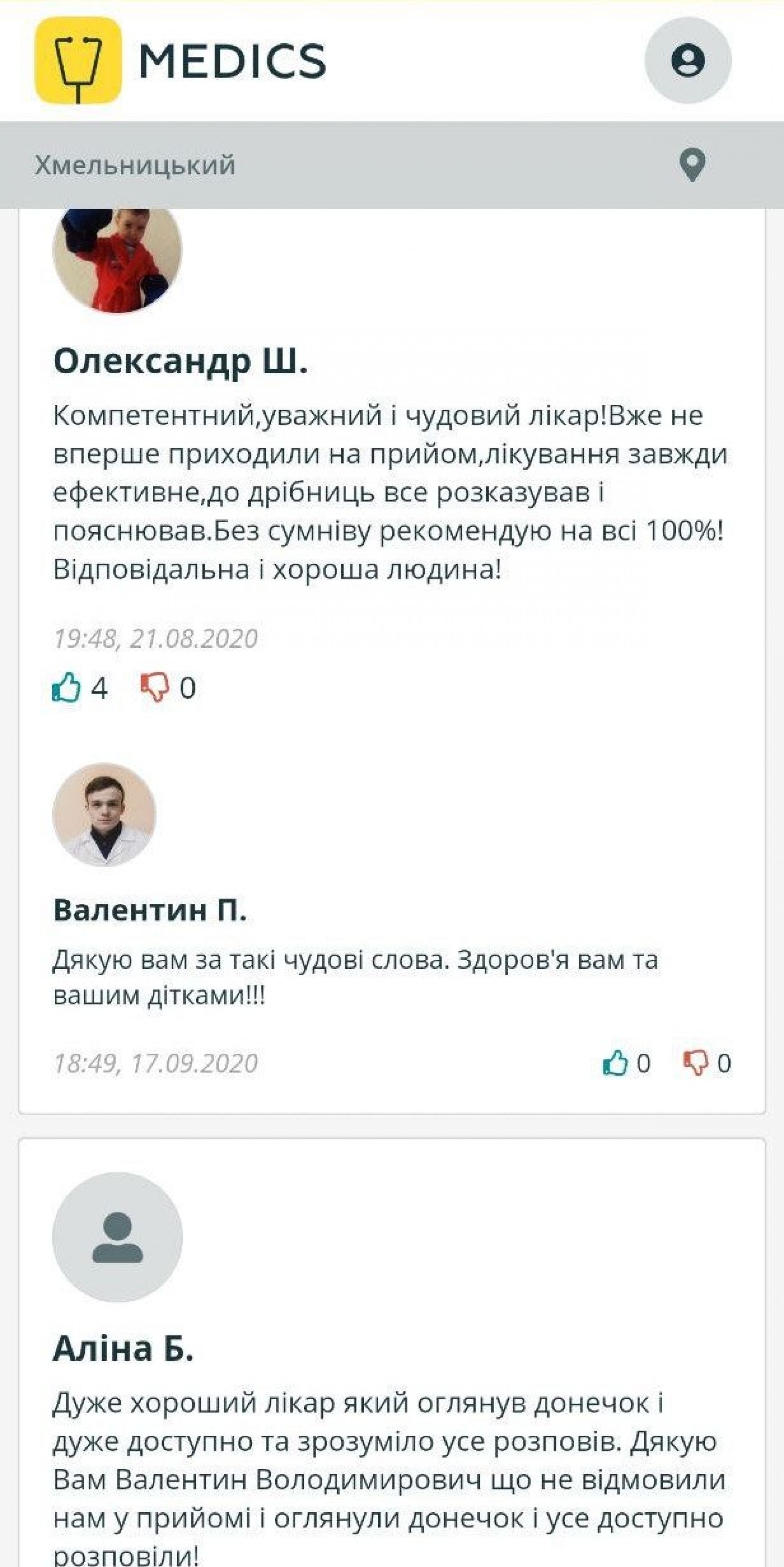Відгуки про лікарів Хмельницького можна переглянути на сервісі medics. Там розміщена адреса, за якою працюють медики. Також деякі фахівці публікують своє фото. Хмельничани можуть поставити свою оцінку лікарю за 5-ти бальною шкалою. Або ж залишити відгук.
