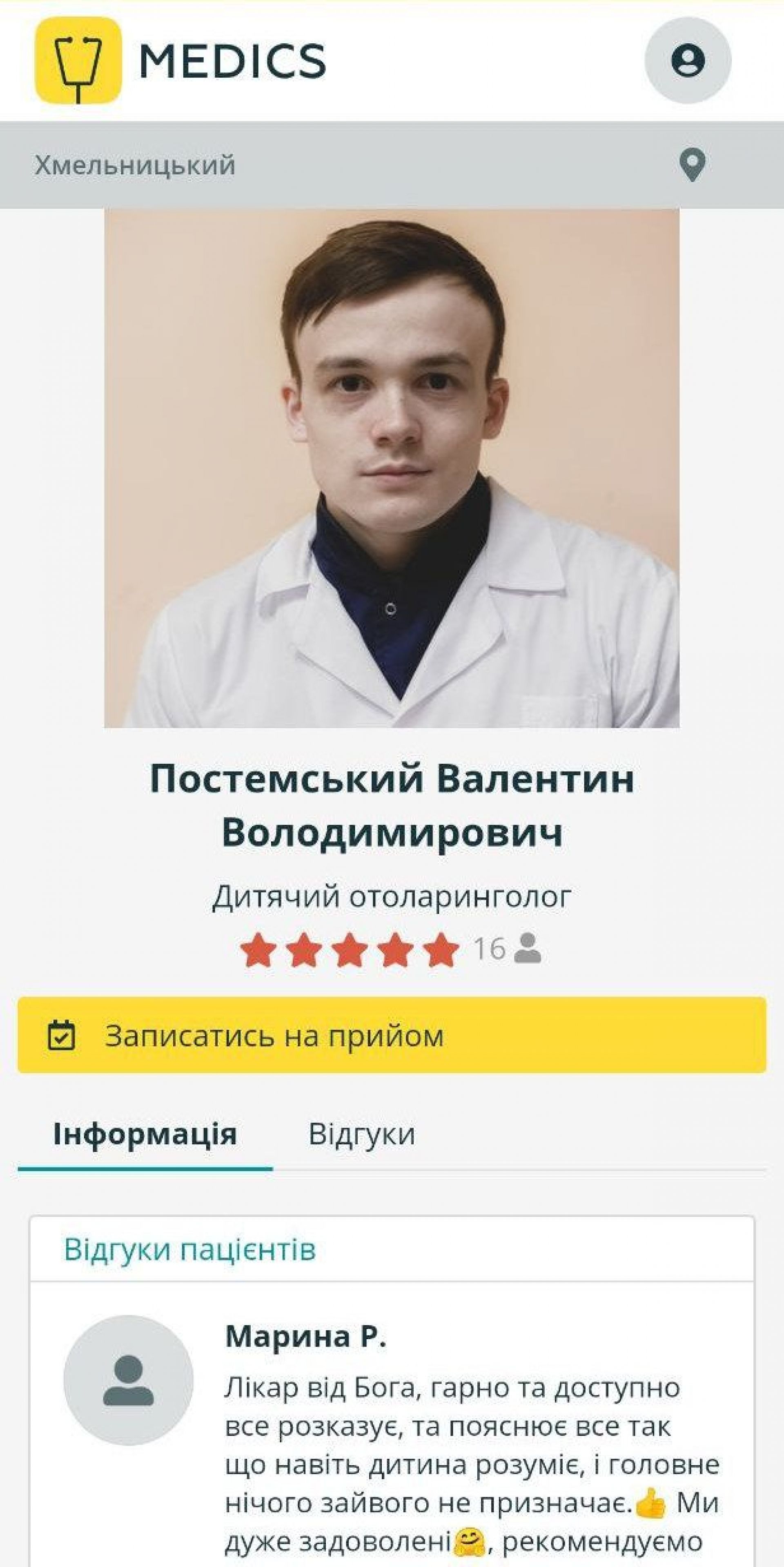 Отоларинголога Валентина Постемського містяни оцінили найвищим балом. А ще залишили 16 коментарів. Усі вони є позитивними.