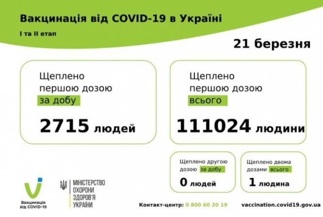 Зазначається, що в Україні щеплено від початку вакцинальної кампанії 111 025 людей, з них отримали 1 дозу – 111 024 особи, завершили вакцинацію (отримали 2 дози) – 1 особа.