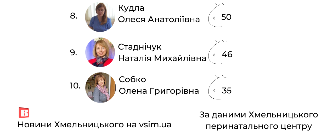 Найбільше вагітних у вище вказаний період обслуговувала Ольга Маліванчук. У неї на обліку перебувало 102 жінки. На сайті Medics пацієнти оцінили її роботу в 4.8 бали з 5. Також про медика залишили 26 відгуків, з яких усі позитивні.