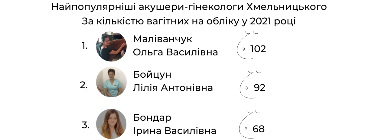 Популярною серед майбутніх мам була акушер-гінеколог Лілія Бойцун. До неї звернулися 92 жінки. Лікарці на Medics поставили 4.9 балів. Крім того, залишили 30 відгуків, з яких всі є позитивними. Більше про Лілію Бойцун читайте в матеріалі Популярні гінекологи Хмельницького: інтерв’ю з Лілією Бойцун.