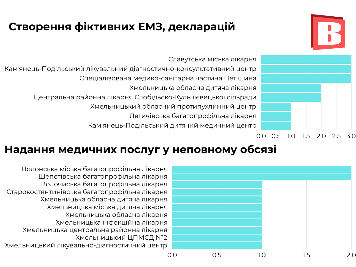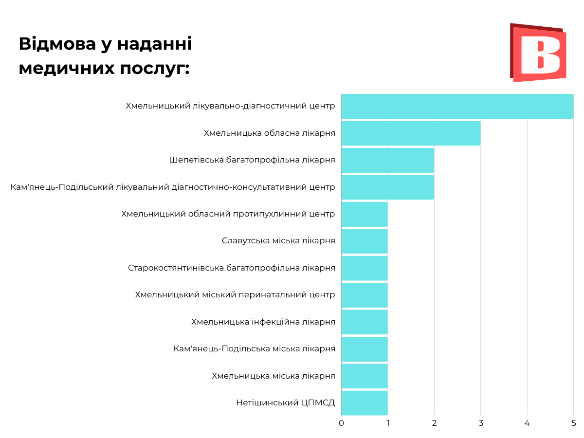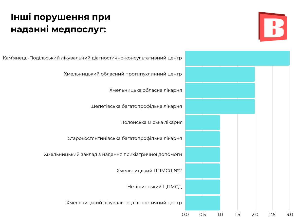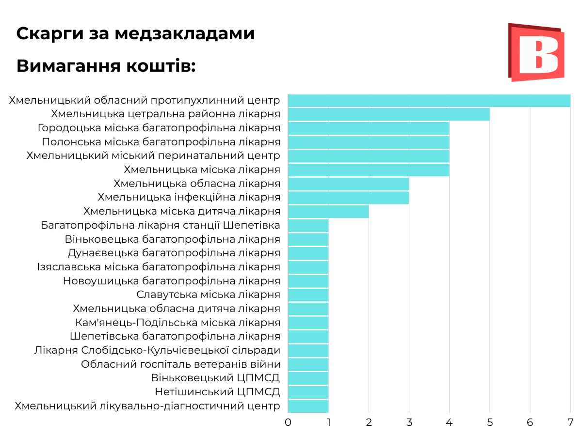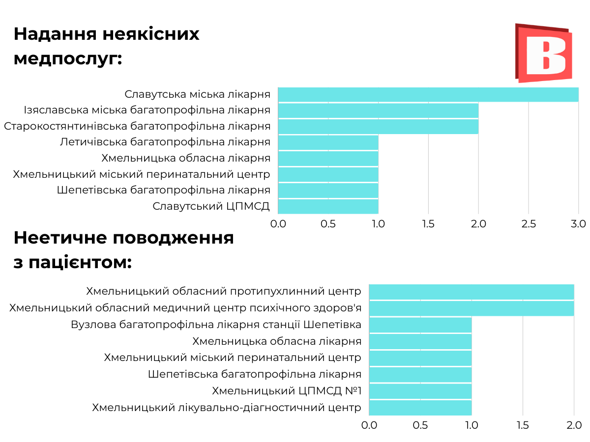 З-поміж медзакладів, на які скаржилися люди – Хмельницький обласний протипухлинний центр, Хмельницька міська лікарня, Хмельницький міський перинатальний центр, міська інфекційна лікарня, Хмельницька обласна лікарня та інші заклади, які функціонують по області.