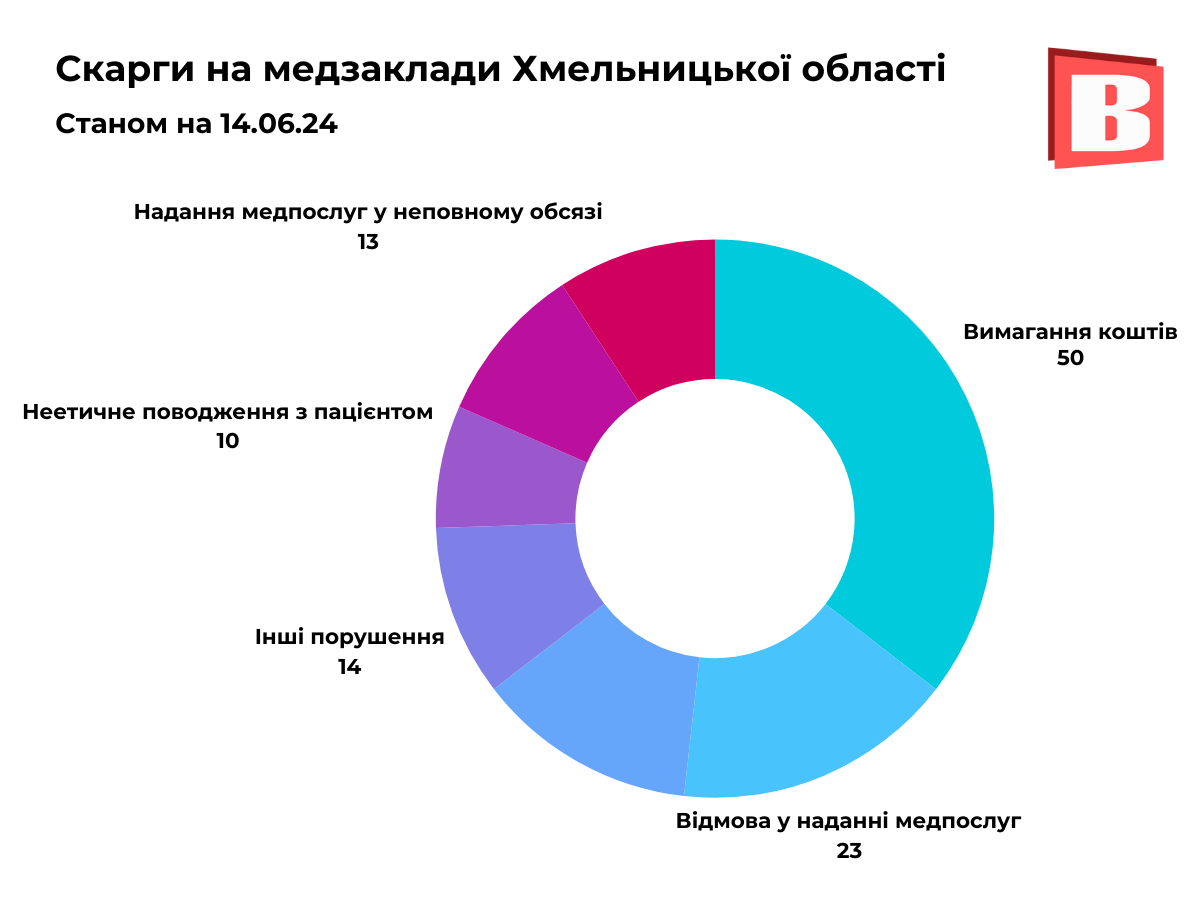 Найбільше скарг до НСЗУ подали щодо вимагання коштів – 50. З такими випадками найчастіше стикалися у Хмельницькому обласному протипухлинному центрі – 7 скарг. Найменше – щодо неетичного поводження з пацієнтом – 10.