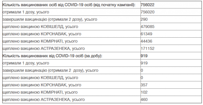 За даними МОЗ, з початку прищеплювальної кампанії в країні прищепили 756 022 людини, з них отримали дві дози - 290 осіб.
