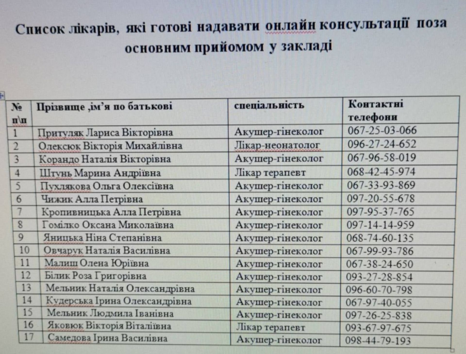 До слова, деякі акушери-гінекологи готові надавати онлайн-консультації поза основним прийомом у закладі. Ось список лікарів: