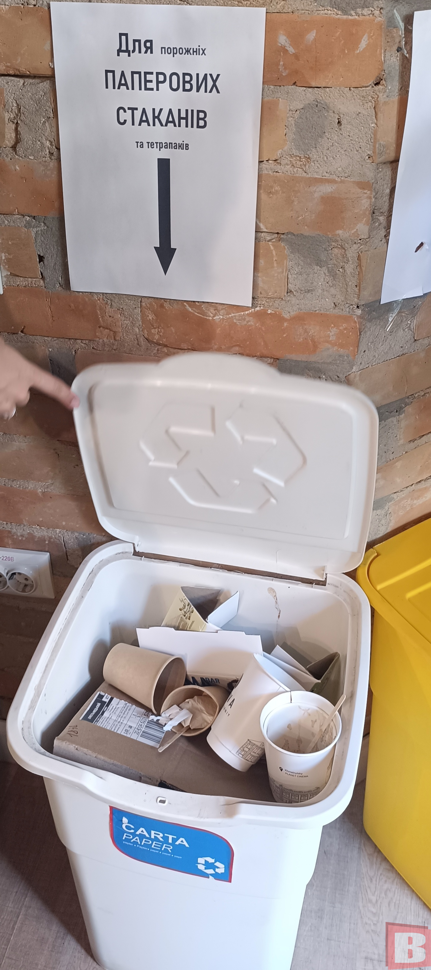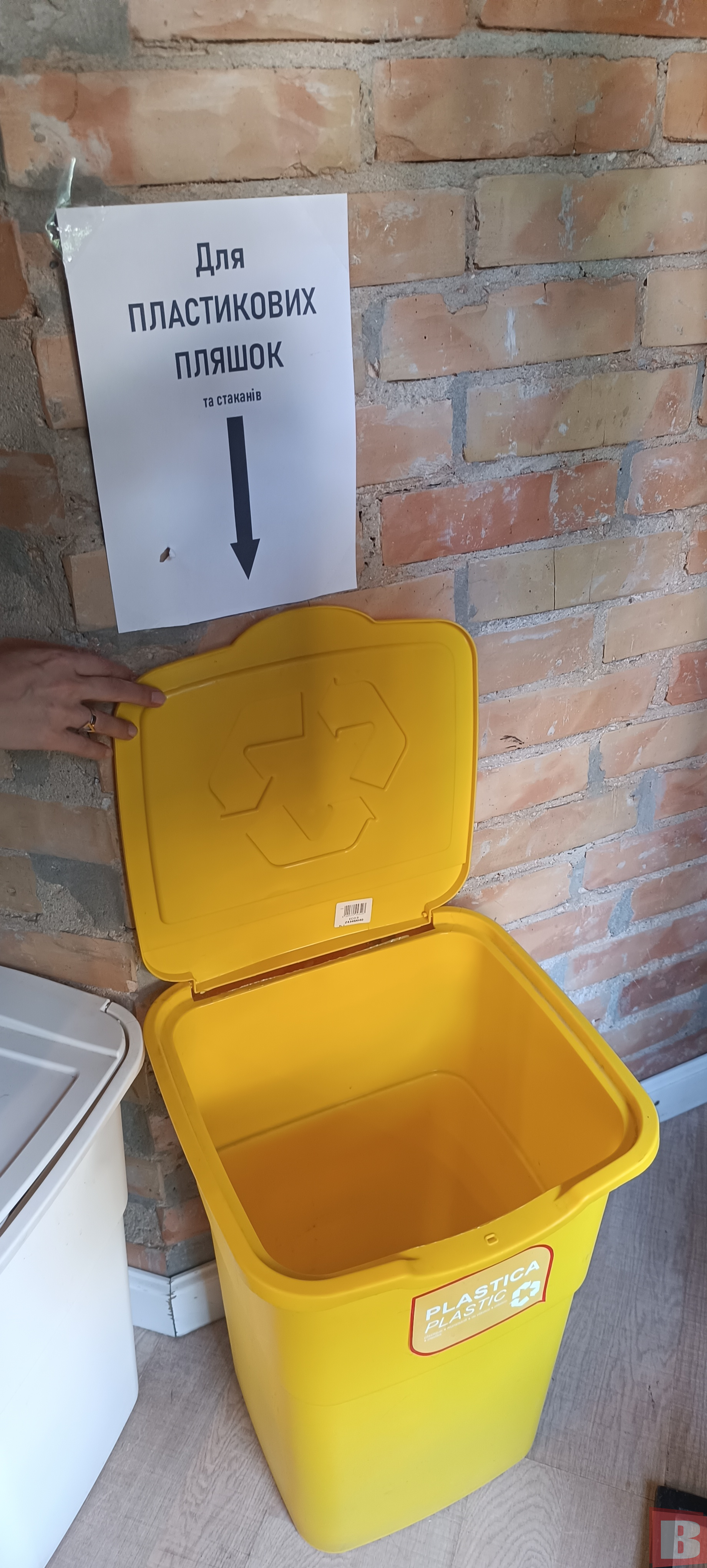 У приміщенні є кілька контейнерів, ще близька десятка – на подвір’ї. В окремий бак йдуть Tetra-пакети, в інший – папір і картон. Також окремо сортують відходи з пластику, металу і скла.