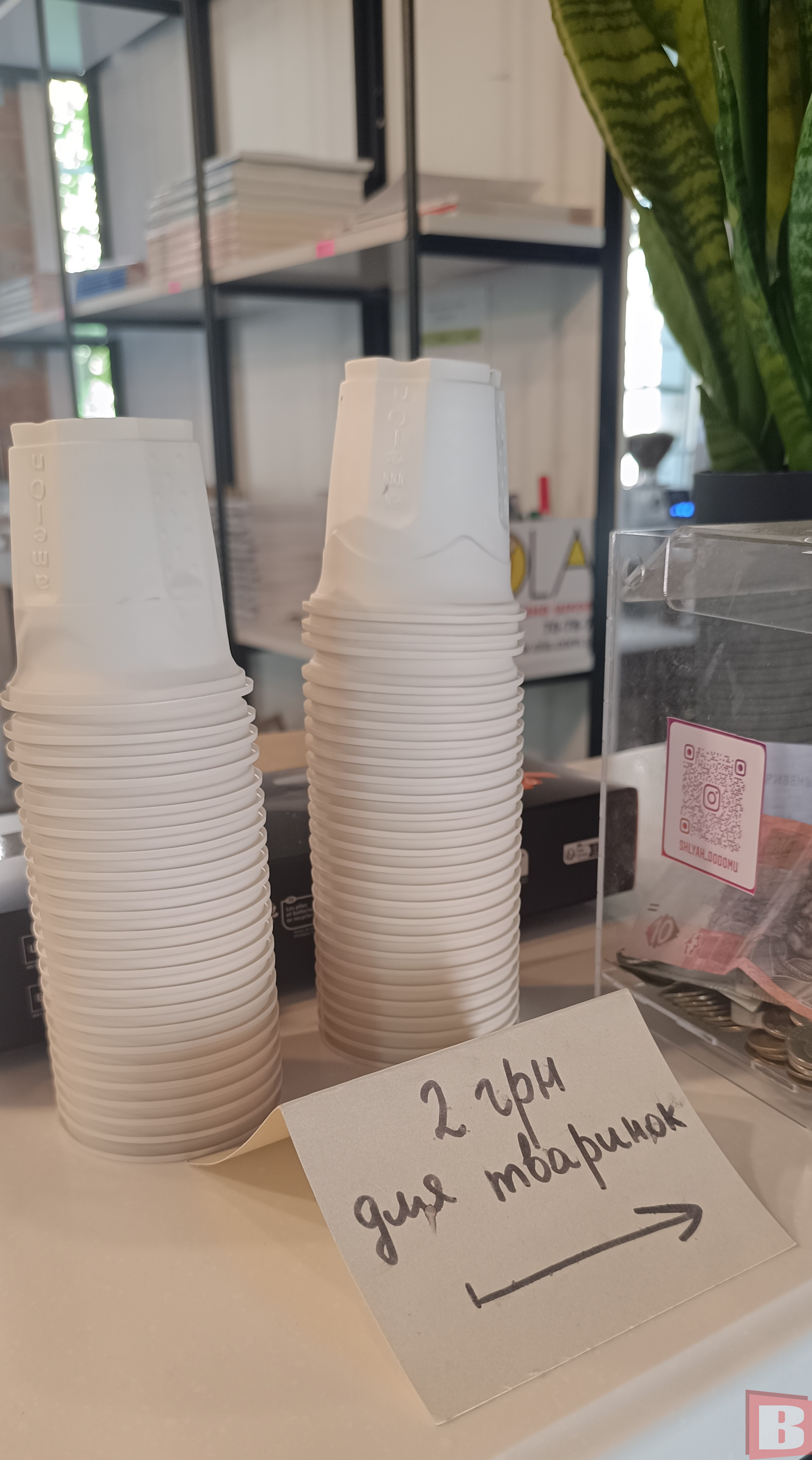 У закладі немає пластикових стаканчиків біля кулеру з водою. Це для того, аби у хмельничан сформувати звичку берегти довкілля і користуватись багаторазовим посудом. До слова, біля рецепції можна придбати спеціальні біорозкладні стаканчики за 2 гривні. Ці кошти йдуть на допомогу тваринам.