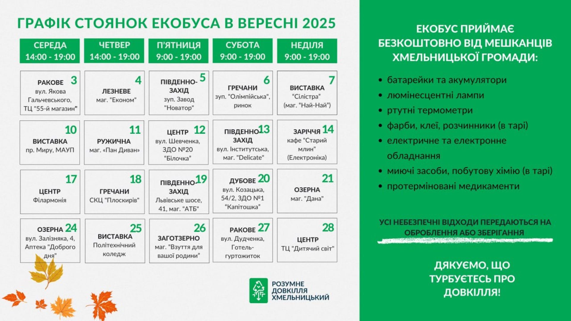 У вересні екобус продовжить свою роботу в обласному центрі. В перший місяць осені він побуває на 20 локаціях у місті. Там хмельничани зможуть здати небезпечні відходи, аби вони не потрапили у довкілля. Послуга безкоштовна. Про це інформують у міській раді.