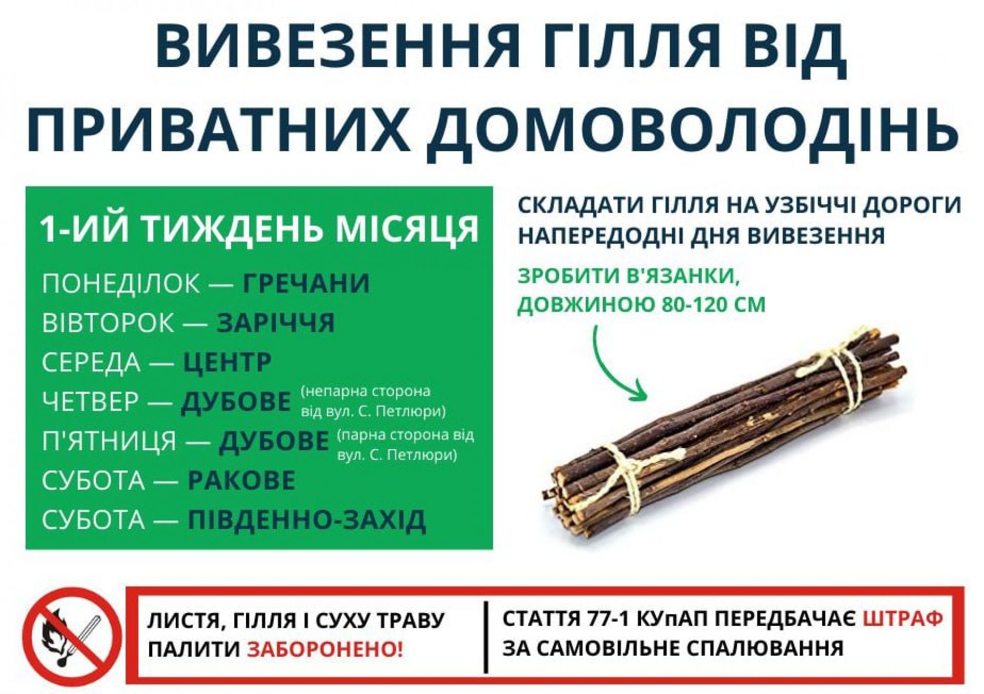 У червні гілки забиратимуть протягом першого тижня місяця. Щоб комунальники могли їх забрати, потрібно заздалегідь зробити в’язанки довжиною 80–120 см і викласти їх у визначених місцях напередодні дня вивезення.