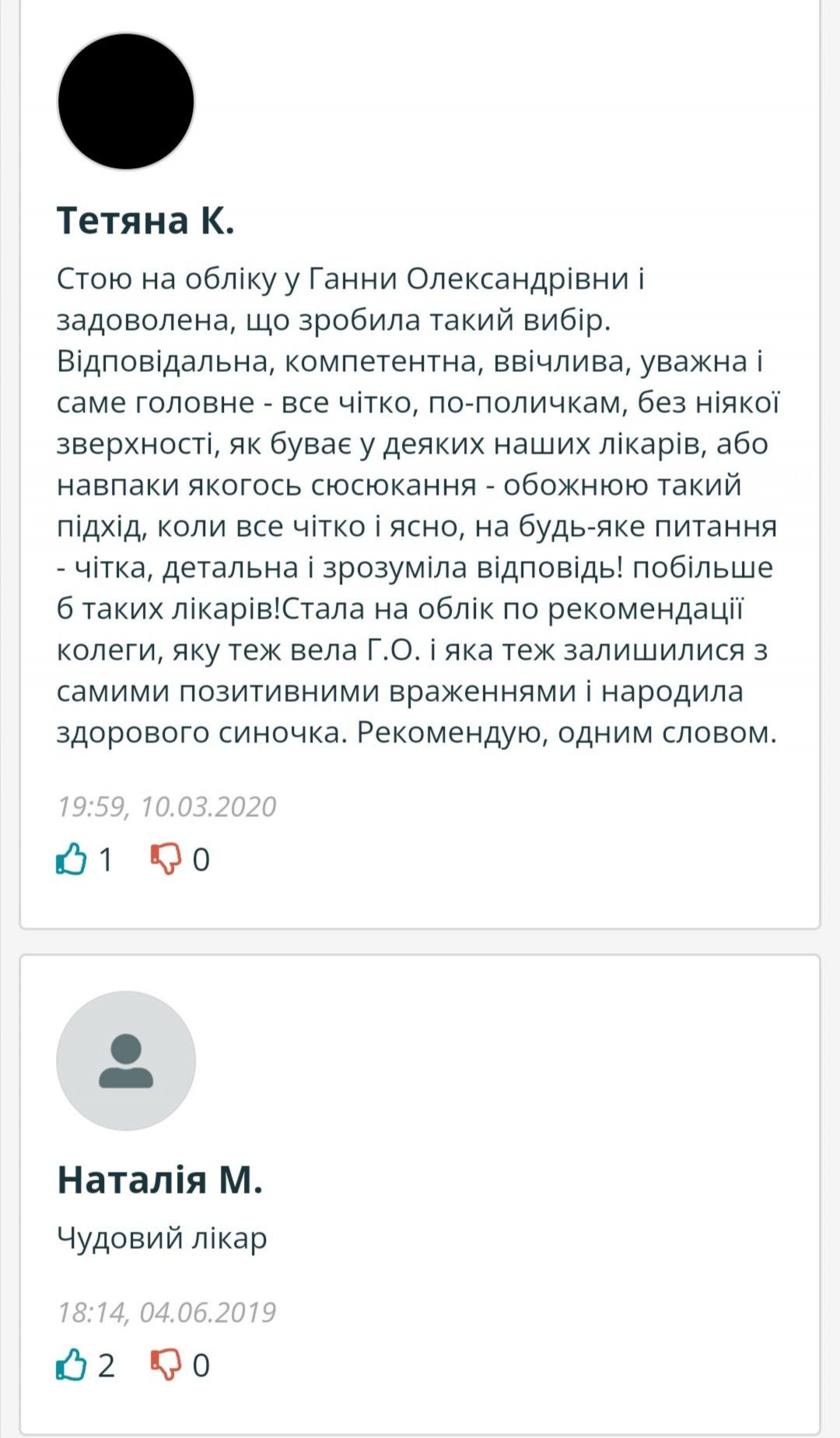 — Я до всіх відгуків ставлюся позитивно. Насправді я знаю хто і які відгуки пише. Дуже погано, що пацієнтки мають право писати все, а лікарі не можуть зазначити, як все було насправді й чому такий відгук з’явився. Чимало людей нашого міста живе із провінційними поглядами на життя. Тому причина негативних відгуків може бути банальна - ти можеш комусь не подобатися, от і все. Тому в мене спокійне ставлення до негативу. Він може виникнути навіть тоді, як пацієнтки пишуть о першій годині ночі, а я не відписую. Тоді вони надсилають повідомлення: “Вам що, важко відповісти?” От після таких нюансів і з'являються негативні відгуки.