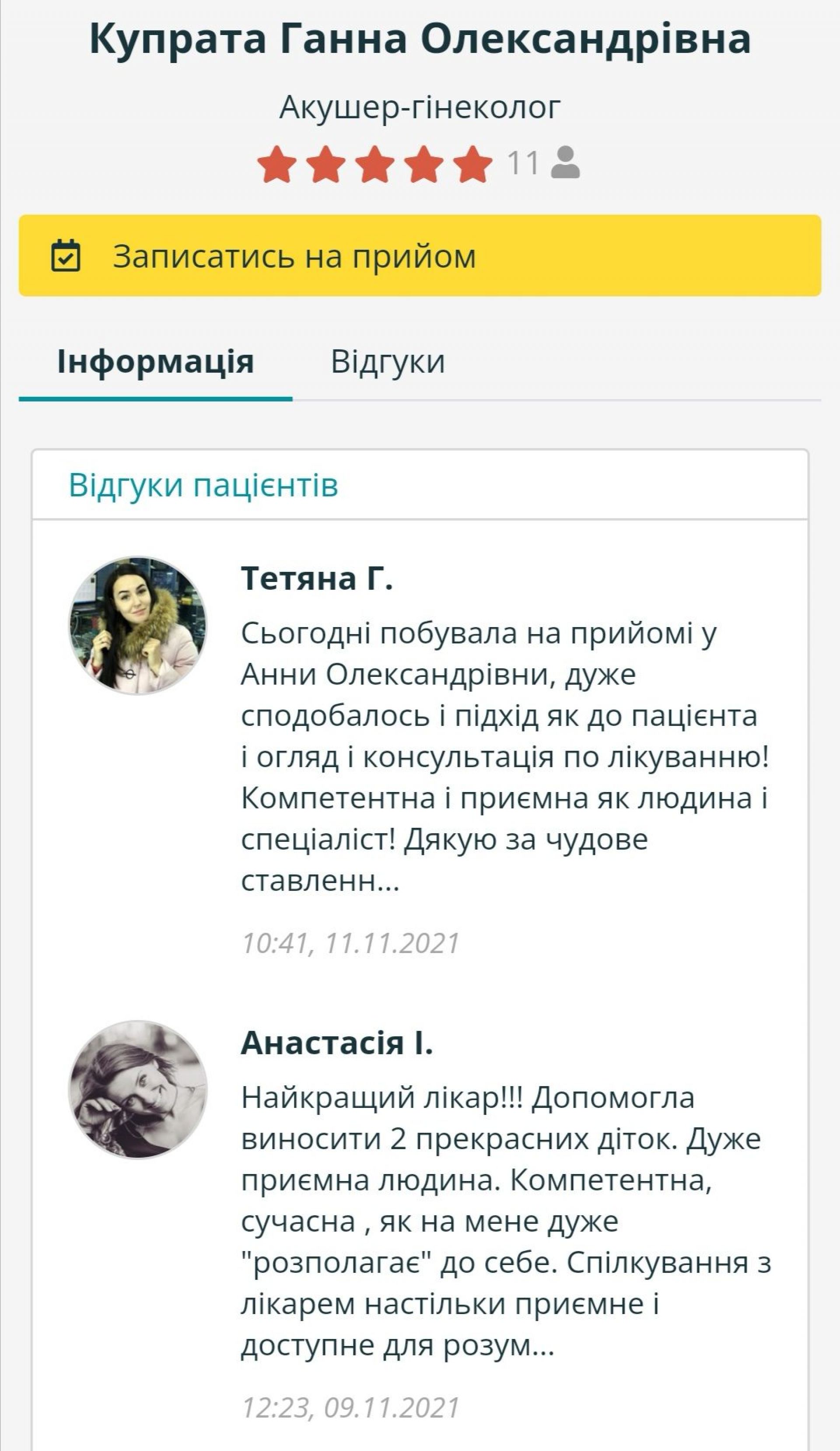 Анна Купрата приймає в міському перинатальному центрі у будні дні. Записатися на прийом можна через сервіс Medics. Там, до речі, жінки залишають відгуки про лікарку. Таких вже є 11. Серед них - лише позитивні.