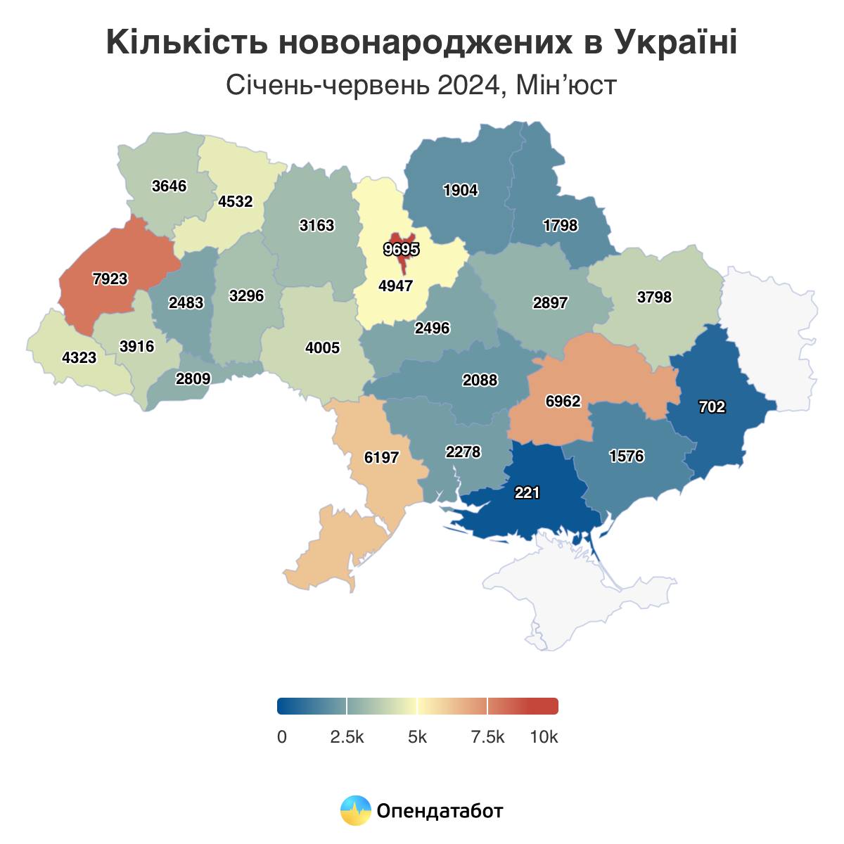 У порівнянні з періодом до повномасштабного вторгнення, народжуваність цьогоріч скоротилася в 1,5 рази: 87 655 дітей проти 132 595 у 2021 році. На Хмельниччині зареєстровано 3296 новонароджених за перше півріччя. Найбільше новонароджених зареєстровано в Києві — 9 695, на Львівщині — 7 923 та Дніпропетровщині — 6 962. Прифронтові регіони відзначаються стабільно низькими показниками: на Херсонщині народилося 221 дитина, на Донеччині — 702, а на Луганщині не зареєстровано жодного новонародженого.