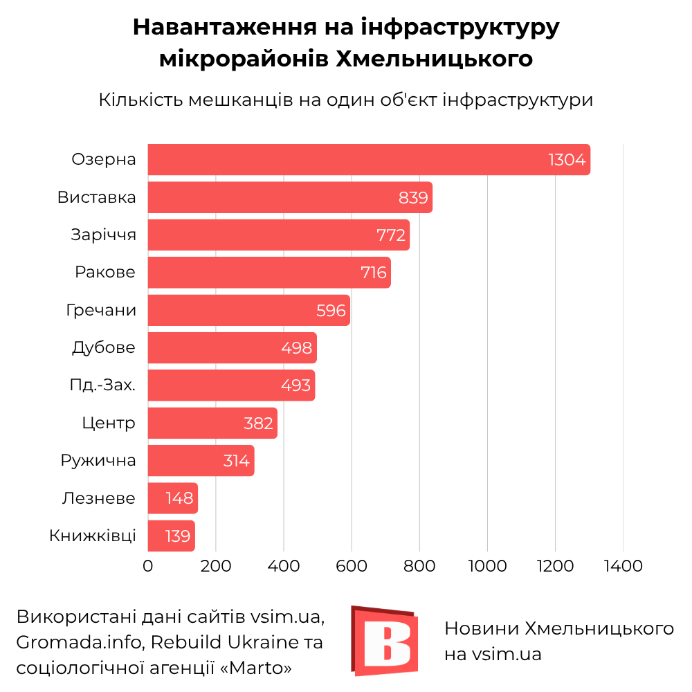 В отриманому рейтингу найбільш перевантаженим мікрорайоном є Озерна, де на кожен об’єкт припадає 1304 мешканці. У лідерах також Виставка та Заріччя, проте навантаженість у них помітно менша. Найменш навантаженою є інфраструктура у Книжківцях. Там на один об’єкт припадає 139 мешканців. Загалом по Хмельницькому показник навантаження складає 542 мешканці на об’єкт інфраструктури. Всі дані переглядайте в інфографіці.