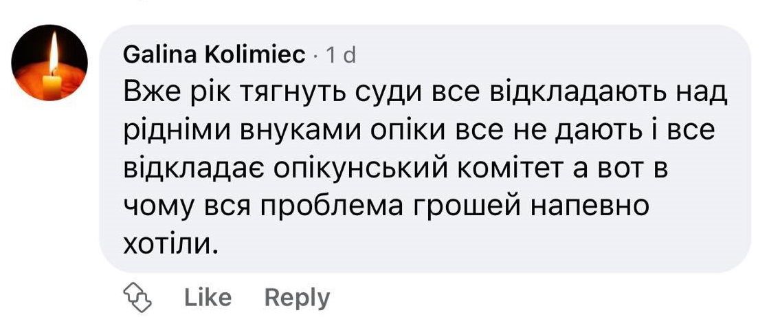 “Вже рік тягнуть суди, все відкладають. Над рідними внуками все опіки не дають. Ось в чому проблема, грошей напевно хотіли”, - зазначають люди в коментарях на сайті ВСІМ.