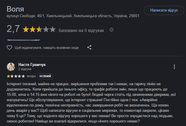 Журналістка ВСІМ знайшла останні відгуки, залишені користувачами в інтернеті під сторінкою офісу на вулиці Свободи. І ось що вони пишуть.