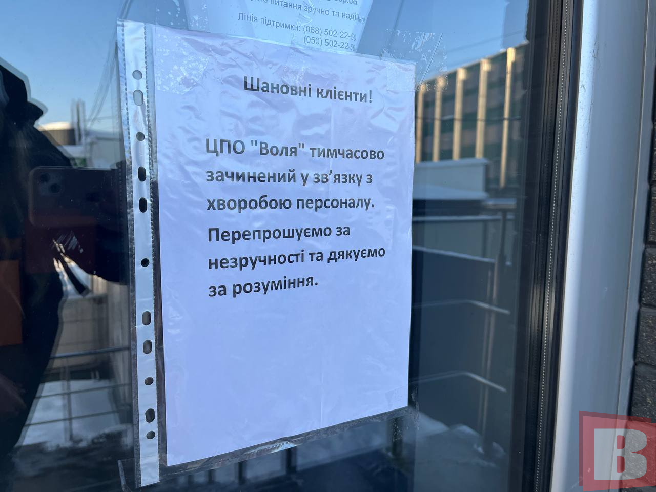 Журналістка ВСІМ пішла до офісу. 16 січня 2026 року, на поручнях біля сходів, як підійматися до входу, й безпосередньо на дверях висить оголошення — офіс тимчасово не працює у зв’язку із хворобою працівників.